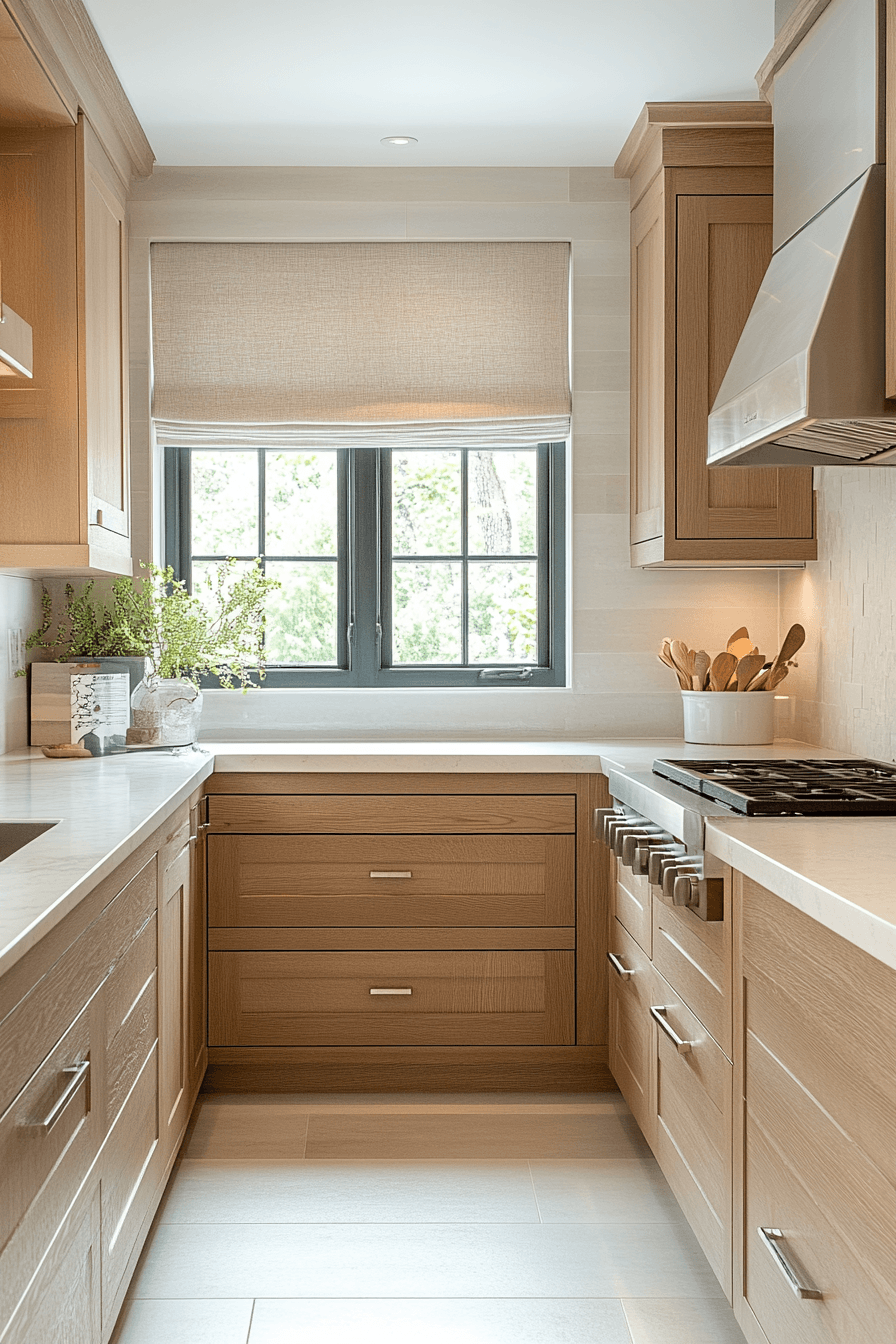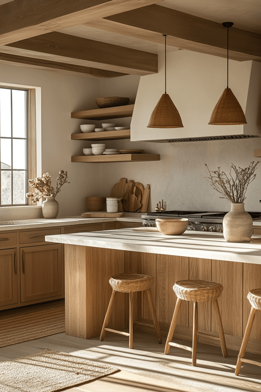 Natural wood elements bring warmth and character into a cozy kitchen while keeping the overall feel light and modern. Pale oak cabinetry and open shelving highlight the beauty of the wood grain without overwhelming the design. Paired with warm lighting, the space feels relaxed and easy to enjoy. The light tones reflect brightness, helping even small kitchens feel more spacious. It’s a perfect mix of natural texture and clean simplicity. Tap to explore more light wood kitchen ideas.