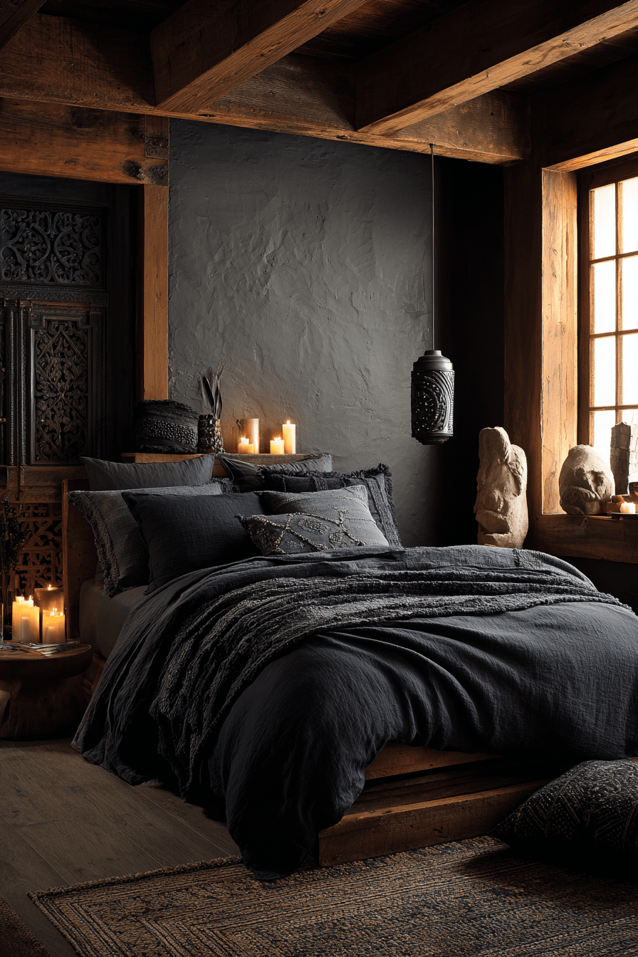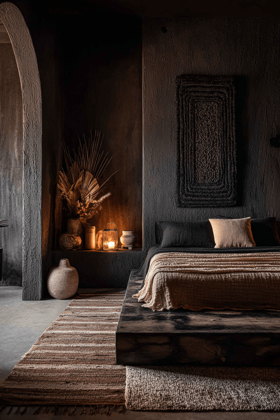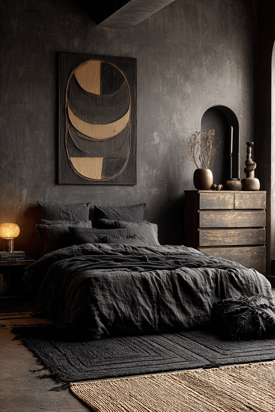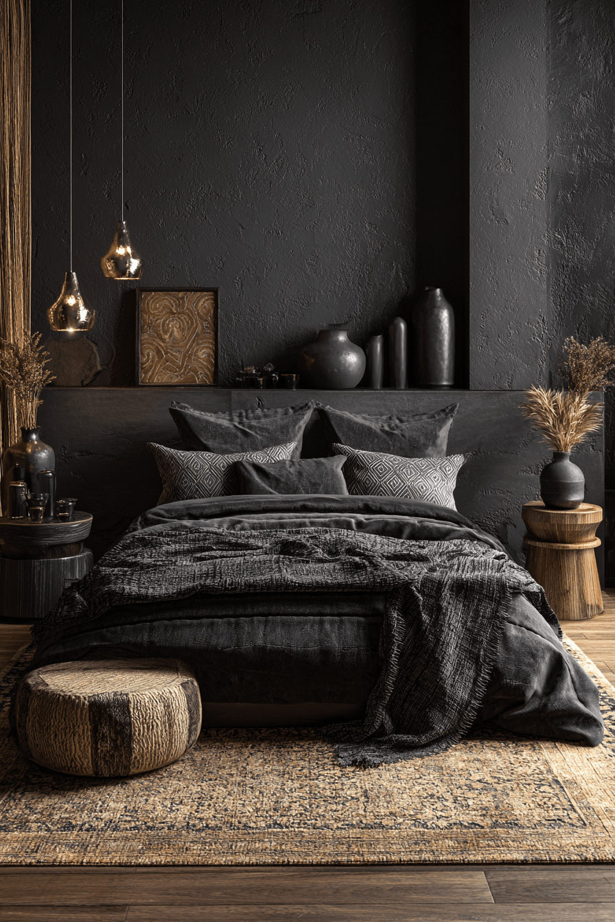 Bold black tones and soft, layered textiles come together to define a dark boho bedroom that feels grounded and visually striking. The contrast between deep hues and clean, minimal shapes creates a look that feels both modern and relaxed. Rich charcoal bedding, dark wood furniture, and textured fabrics add depth without relying on bright color. Every layer contributes to a cozy yet dramatic atmosphere. The space feels balanced, moody, and effortlessly bohemian. Tap to see how obsidian-inspired styling can transform your bedroom.