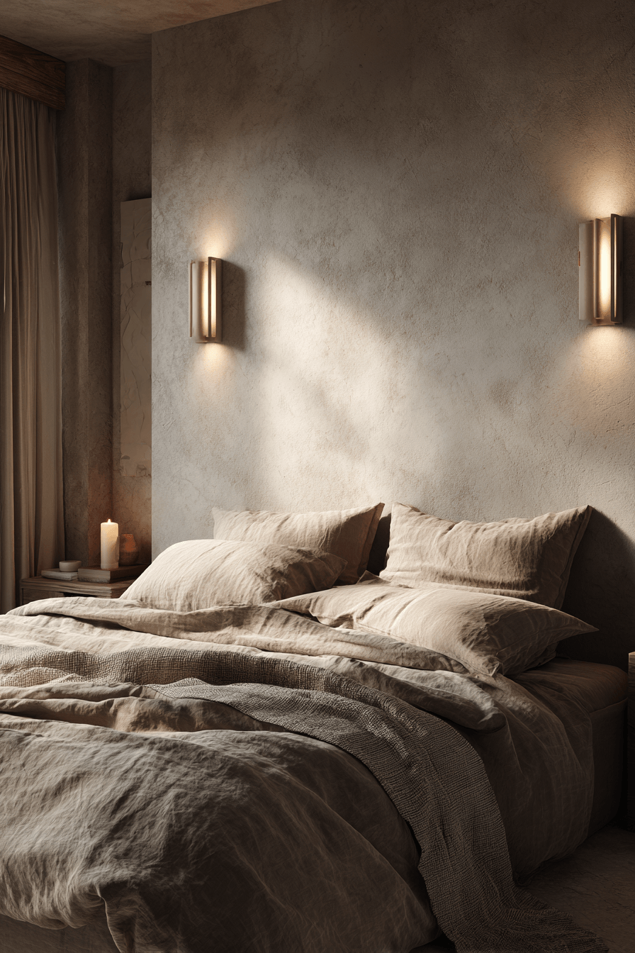 A soft, radiant atmosphere defines this dark boho bedroom with its mix of gentle grays, taupes, and warm ambient lighting. Subtle glows from candles and underlighting create a cozy, welcoming feel that instantly draws you in. Minimal furnishings paired with textured accents keep the space visually interesting without clutter. This dark boho bedroom delivers a moody look that still feels light and inviting. It’s perfect for those who want depth without heaviness. Tap into this glowing style and refresh your bedroom today!