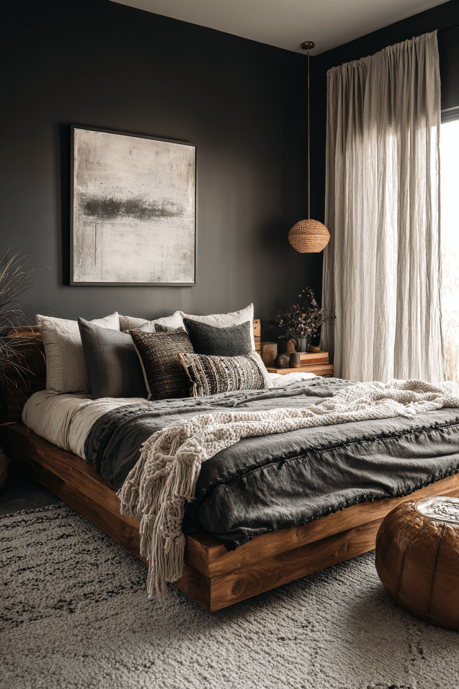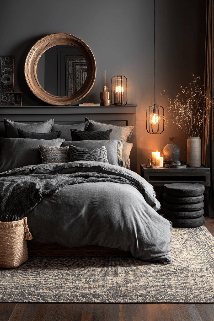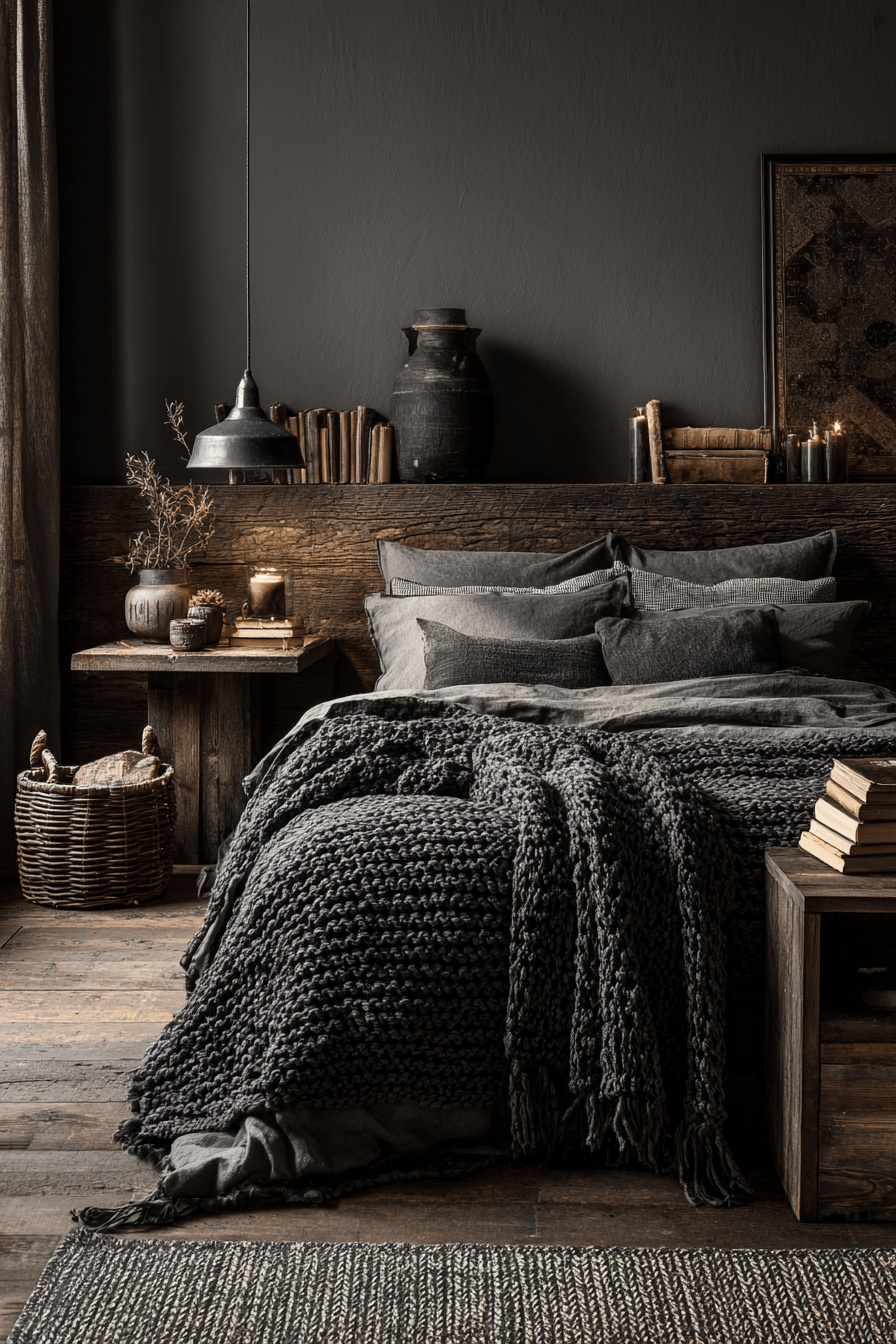 Quiet drama fills this dark boho bedroom through deep gray tones, plush fabrics, and oversized cozy layers. Soft cotton bedding and rich textures create a space that feels indulgent yet relaxed. Rugged finishes like matte walls or subtle stone accents add contrast and character. This dark boho bedroom balances comfort with visual richness in an effortless way. It’s designed for those who want a cozy retreat with a bold edge. Unlock more comfort-forward inspiration and transform your space now!