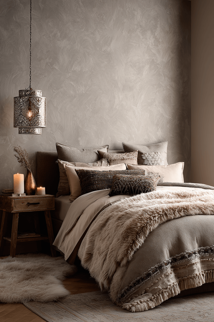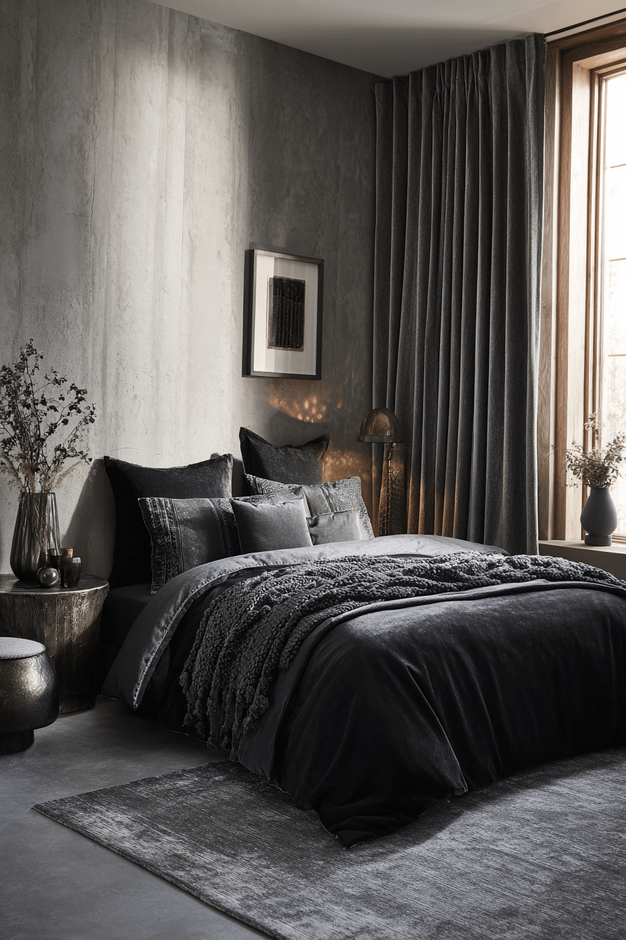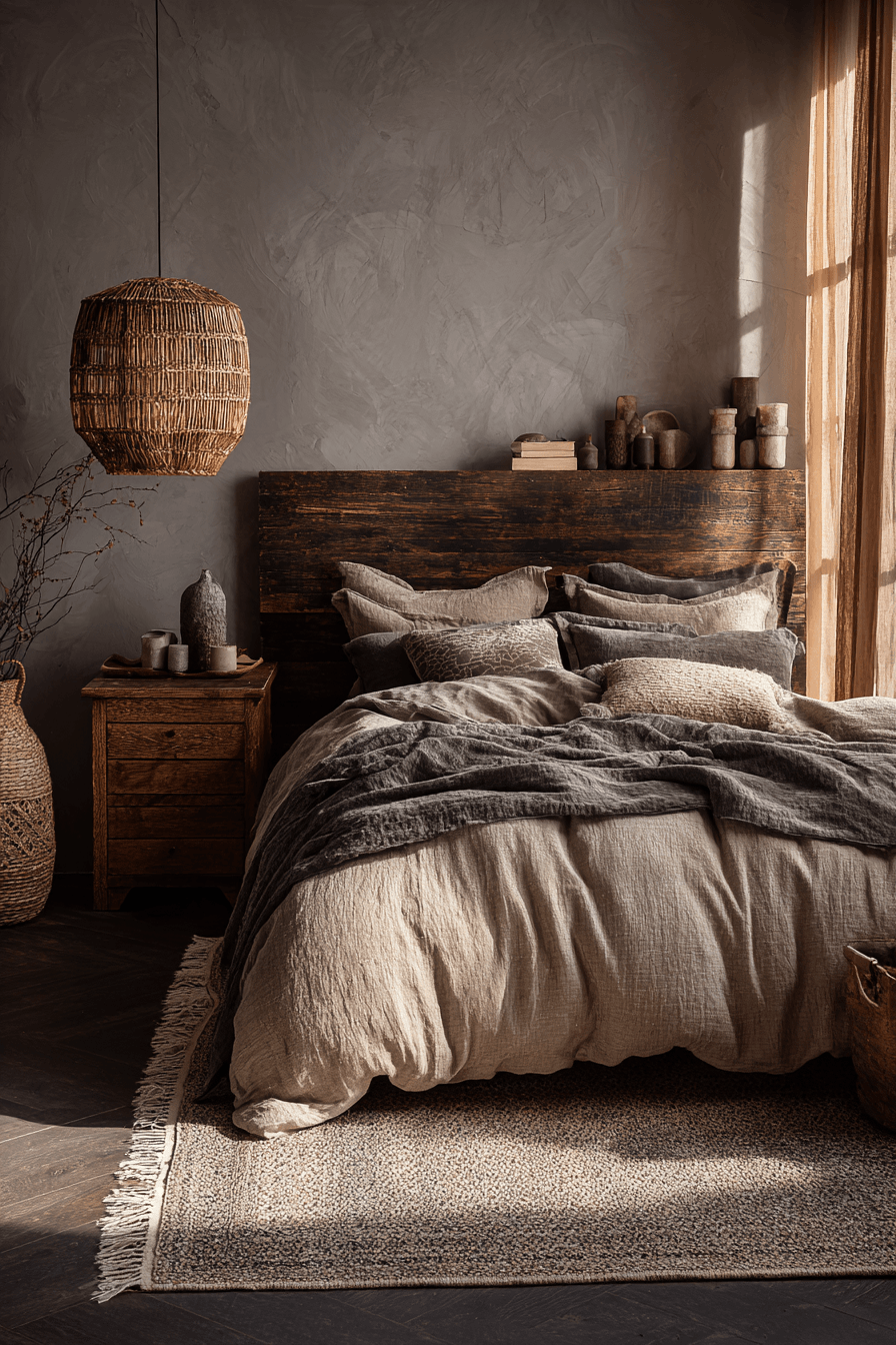 Quiet drama fills this dark boho bedroom through deep gray tones, plush fabrics, and oversized cozy layers. Soft cotton bedding and rich textures create a space that feels indulgent yet relaxed. Rugged finishes like matte walls or subtle stone accents add contrast and character. This dark boho bedroom balances comfort with visual richness in an effortless way. It’s designed for those who want a cozy retreat with a bold edge. Unlock more comfort-forward inspiration and transform your space now!