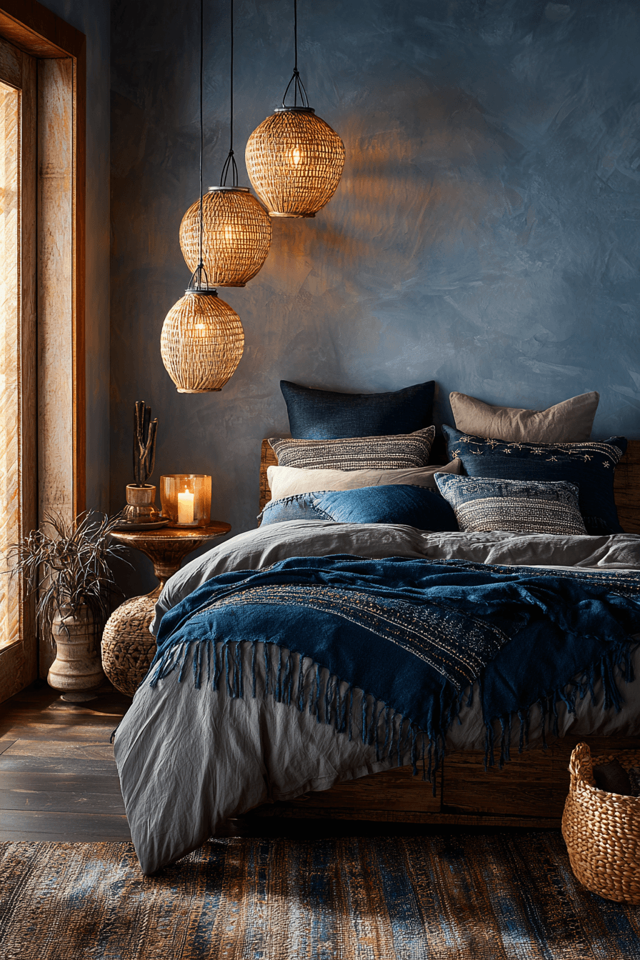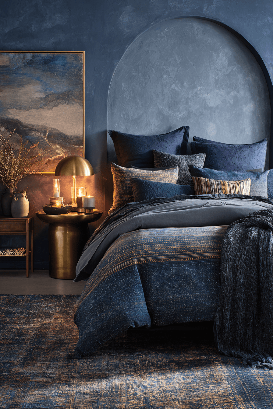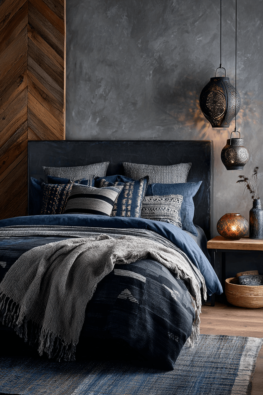Deep, layered tones wrap this dark boho bedroom in a cozy and dramatic atmosphere perfect for unwinding. Navy, slate, and hints of deep purple create a cocoon-like effect that feels intimate and creative. A low-profile bed, soft curves, and plush bedding add to the relaxed feel. The lighting stays soft and warm, enhancing the richness of the colors. The space feels like a peaceful retreat for rest and reflection. Tap to discover more moody bedroom designs that inspire.