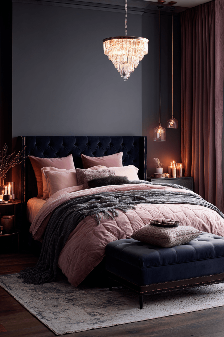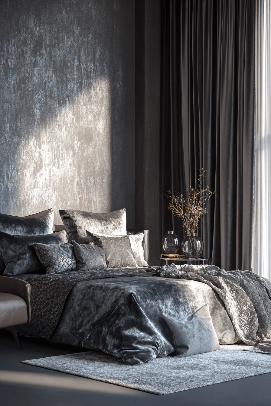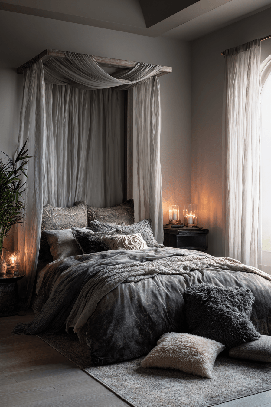 A dreamy, mist-like palette sets the tone in this dark boho bedroom, blending silver-gray, soft black, and muted mauve hues. Layered fabrics and diffused lighting create a gentle, airy softness within the darker tones. Curved lines and flowing textiles enhance the sense of calm and movement. The space feels serene, quiet, and effortlessly elegant. This dark boho bedroom is perfect for minimalists who still crave a touch of moodiness. Tap to explore how fog-inspired tones can elevate your decor!