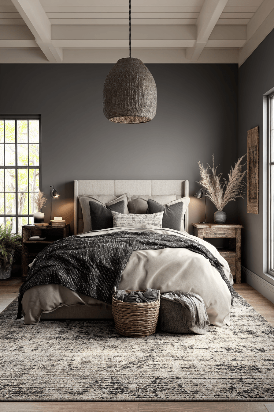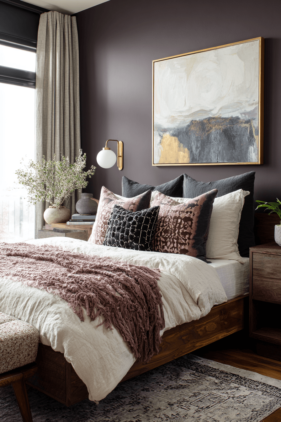 Soft neutrals and moody tones create a dark boho bedroom that feels calm, modern, and uncluttered. Charcoal bedding paired with light wood and subtle metallic accents strikes a perfect balance. Clean lines keep the space feeling open while textures add warmth. The result is a serene environment that still embraces a darker palette. It’s ideal for those who love a minimalist yet cozy vibe. Click to explore more calming dark boho bedroom ideas.