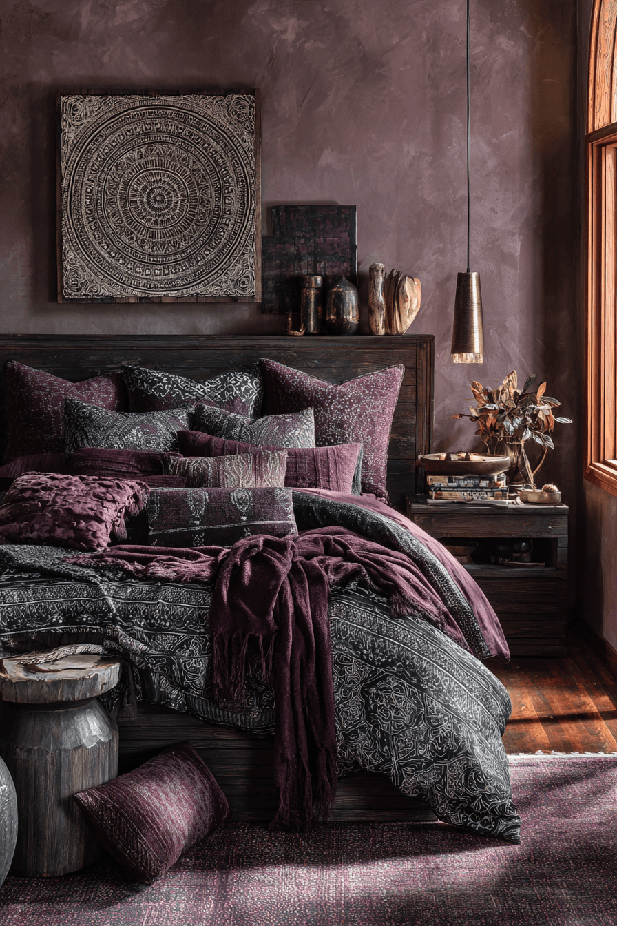 Luxurious softness takes over this dark boho bedroom with velvety textures and a smoky, sophisticated palette. Layers of gray paired with subtle metallic accents like silver or bronze create a refined yet cozy feel. The bed becomes the focal point, surrounded by plush fabrics and warm lighting. This dark boho bedroom blends comfort with elevated design in a seamless way. It’s a perfect choice for anyone craving a soft, moody retreat. Discover how to bring this luxe boho vibe into your home today!