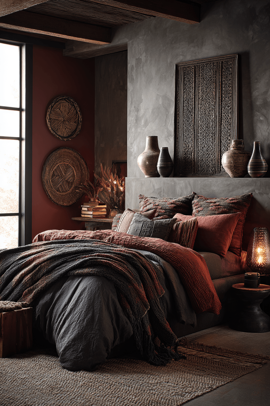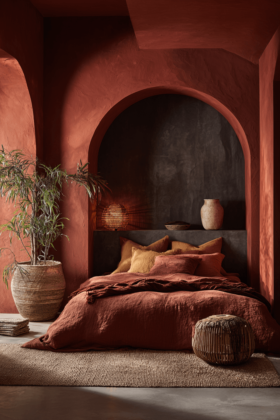 Rich, smoldering hues create a captivating atmosphere in this dark boho bedroom filled with brown-red tones and deep warmth. Matte finishes and simple furnishings keep the look refined while still feeling bold. Clean lines prevent the space from becoming overwhelming, allowing the colors to take focus. The overall effect is both intense and inviting, with a grounded, modern edge. This dark boho bedroom offers a perfect blend of warmth and sophistication. Click to explore more ways to style these cozy tones!