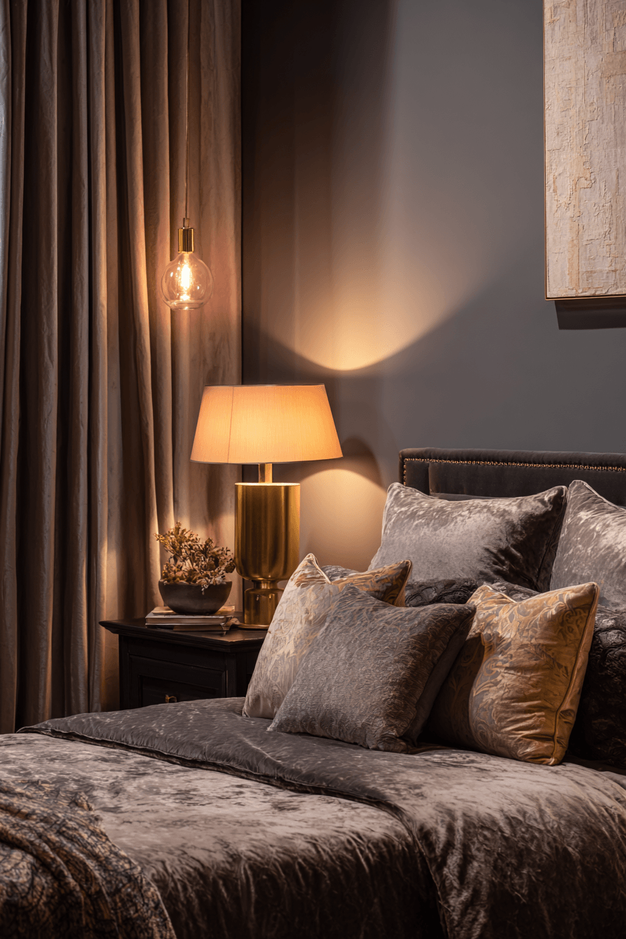 Luxurious details meet relaxed styling in a dark boho bedroom that feels both elevated and inviting. Deep navy, warm taupe, and subtle gold accents create a rich and refined palette. Velvet textures and sleek furniture add a polished touch while still keeping the room comfortable. Soft lighting enhances the warmth and creates a calming glow throughout the space. The overall vibe feels sophisticated yet easy to unwind in. Click to explore how to achieve this moody luxe look.