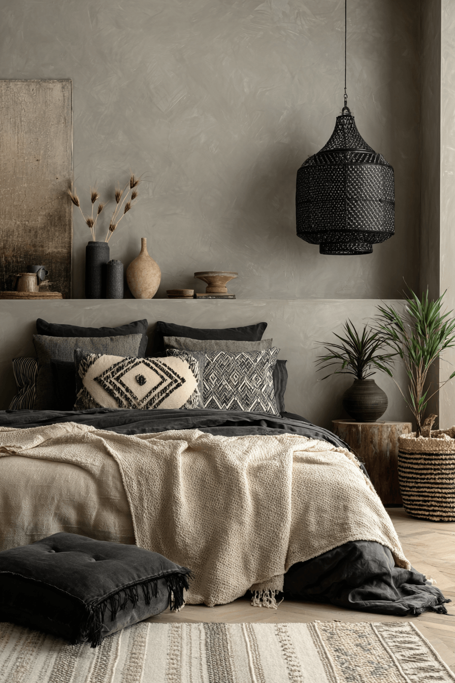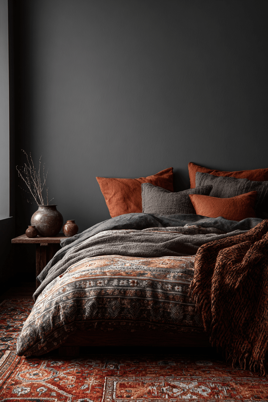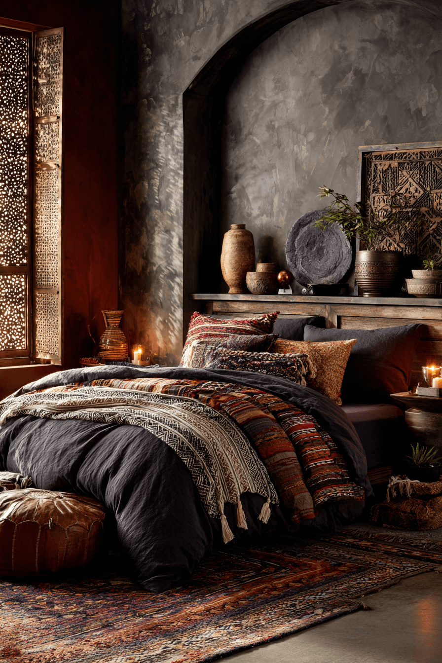 A well-traveled, collected feel defines a dark boho bedroom inspired by wanderlust and personal expression. Layered rugs, sculptural furniture, and earthy tones create a space that feels curated over time. Shades of smoky gray, soft rust, and deep black bring warmth and balance to the design. Each piece adds character and tells a story, making the room feel meaningful. The atmosphere is cozy, grounded, and creatively inspired. Explore more ways to design a space that reflects your unique journey.
