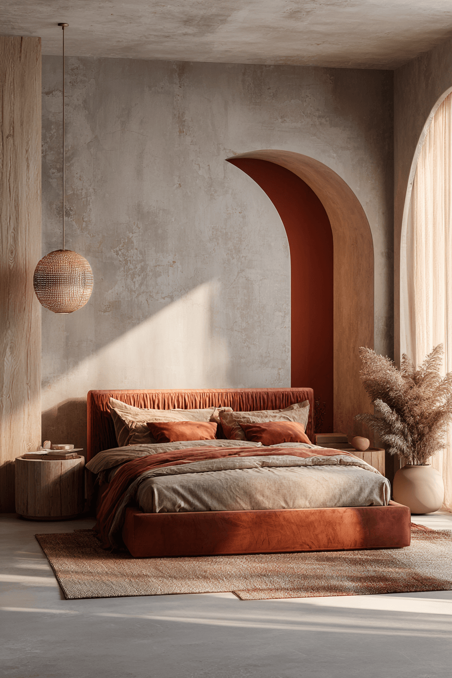 Warm, earthy tones take center stage in this dark boho bedroom, bringing in shades like red clay and burnt umber for a bold yet grounded feel. Curved, modern furniture softens the intensity while keeping the design clean and balanced. Minimal decor allows the rich colors to shine without distraction. The space feels expressive, warm, and full of character. This dark boho bedroom is perfect for those who love a striking yet cozy environment. Tap here to get inspired by this earthy, dramatic style!