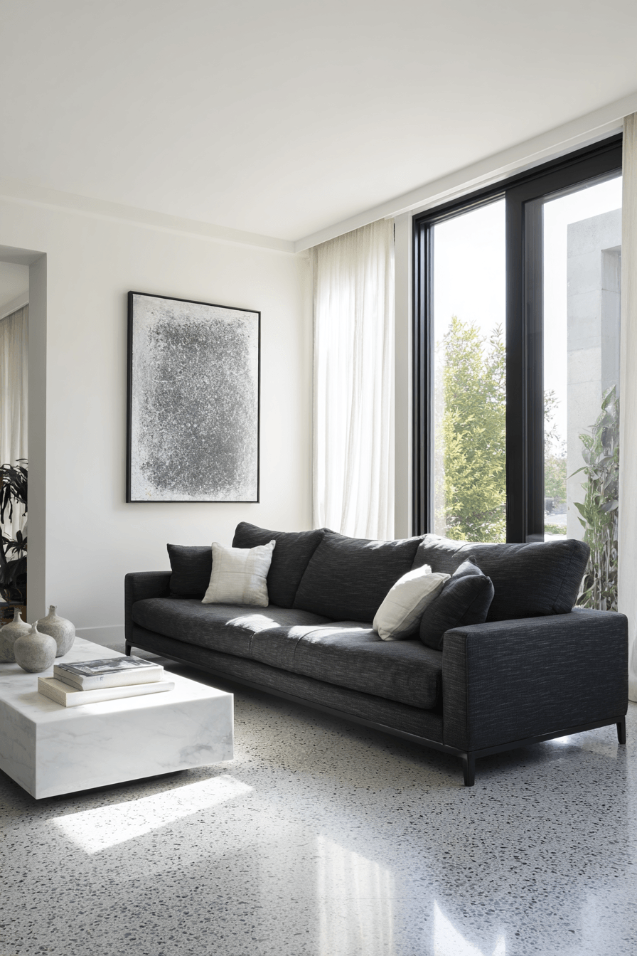 A dark grey sofa living room feels effortlessly refined in a modern minimalist setting where clean lines and simplicity lead the design. Bright white walls and soft grey details create a fresh backdrop that allows the sofa to stand out beautifully. The open layout keeps the room feeling calm, airy, and easy to enjoy every day. Black accents or subtle metallic finishes add contrast without taking away from the peaceful atmosphere. This look delivers a polished style that still feels warm and livable. Explore this minimalist approach and see how it can refresh your space.