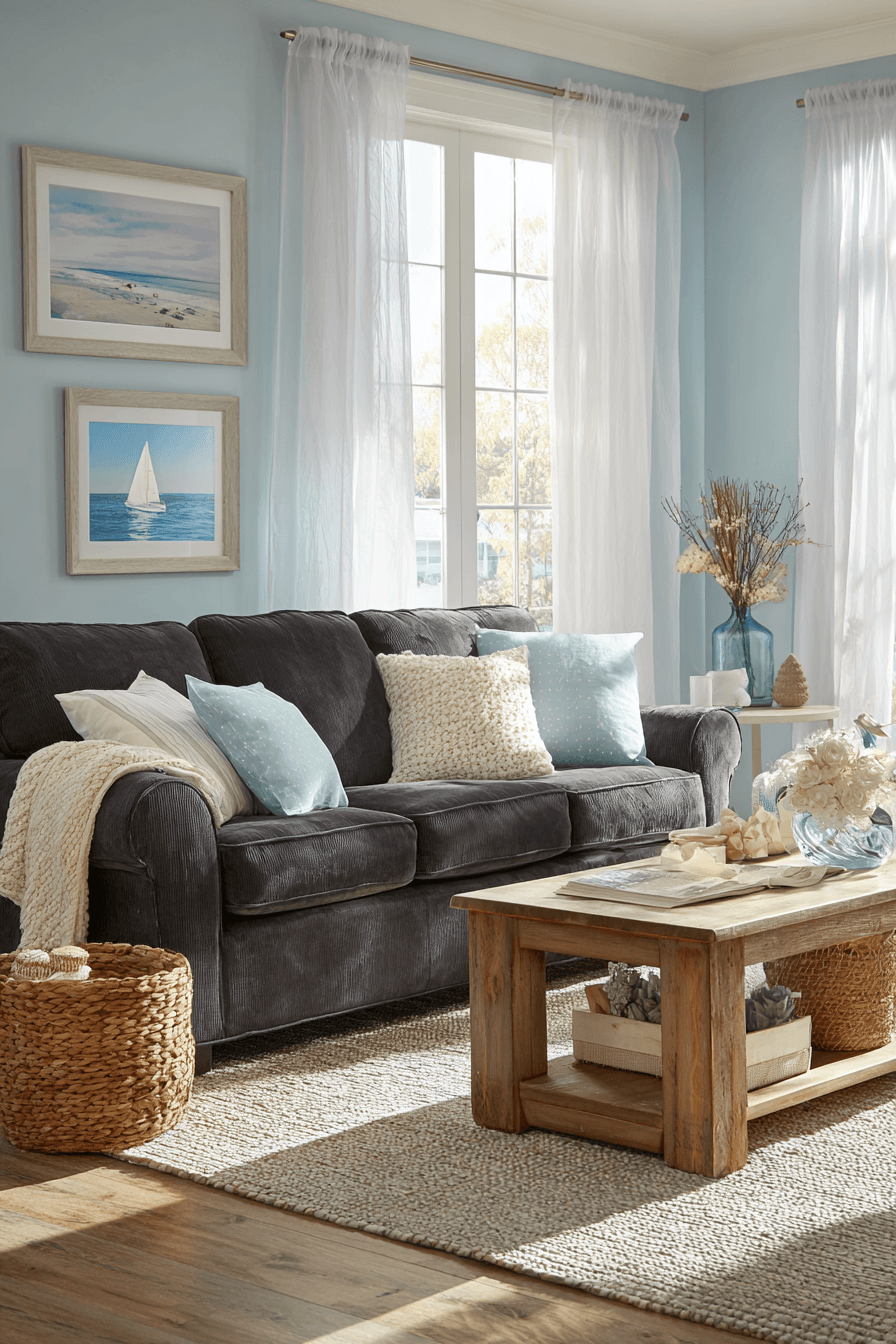 Breezy and relaxed dark grey sofa living room captures the essence of coastal comfort with a grounded twist. Soft blues, sandy neutrals, and airy whites brighten the room while complementing the richness of the sofa. Lightweight fabrics like linen and cotton enhance the fresh, open feel. Natural elements such as driftwood and ocean-inspired accents complete the serene atmosphere. The result is calm, stylish, and effortlessly refreshing. Explore more coastal-inspired ideas and bring the beachy vibe home.