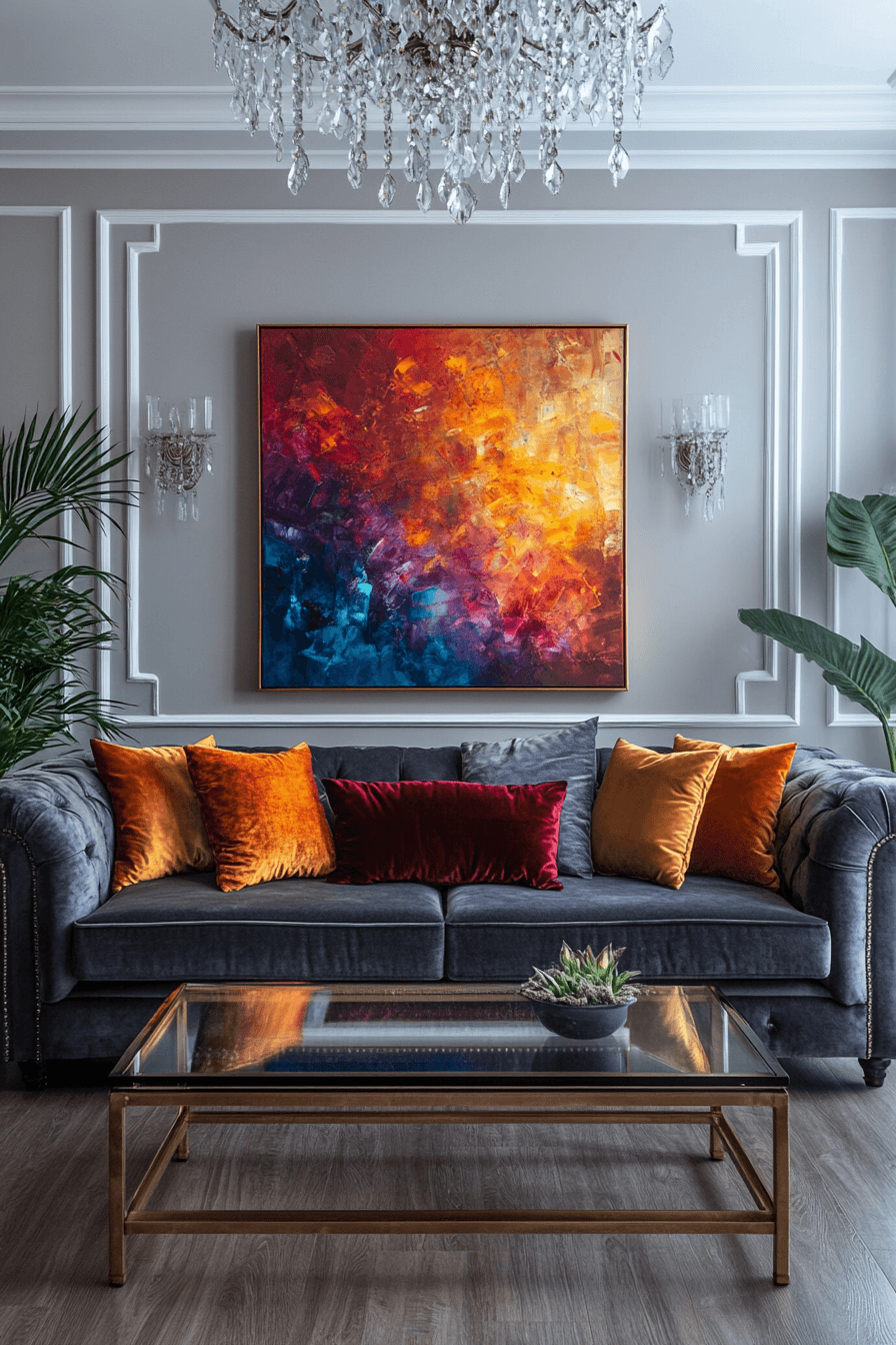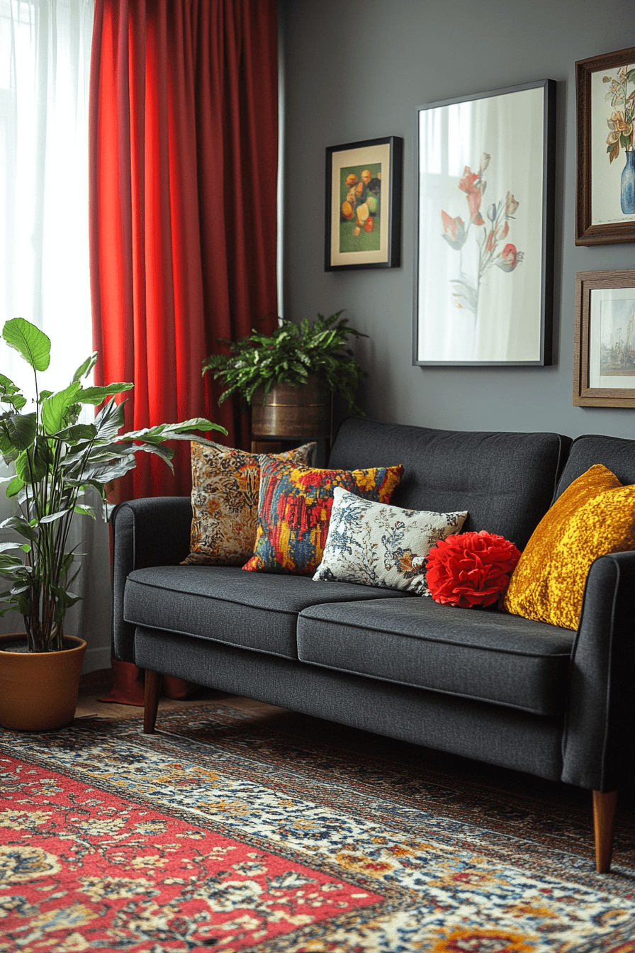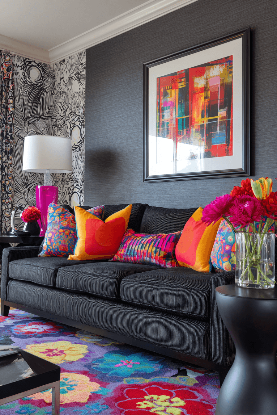 A bold and lively dark grey sofa living room instantly draws attention with its vibrant mix of color and creativity. The deep grey sofa anchors the space while bright artwork and playful decor bring it to life. Geometric patterns and sculptural lighting add movement and visual excitement throughout the room. Every detail feels intentional, expressive, and full of personality. This look is perfect for anyone who loves to make a statement. Dive into more daring design inspiration and refresh your space now.
