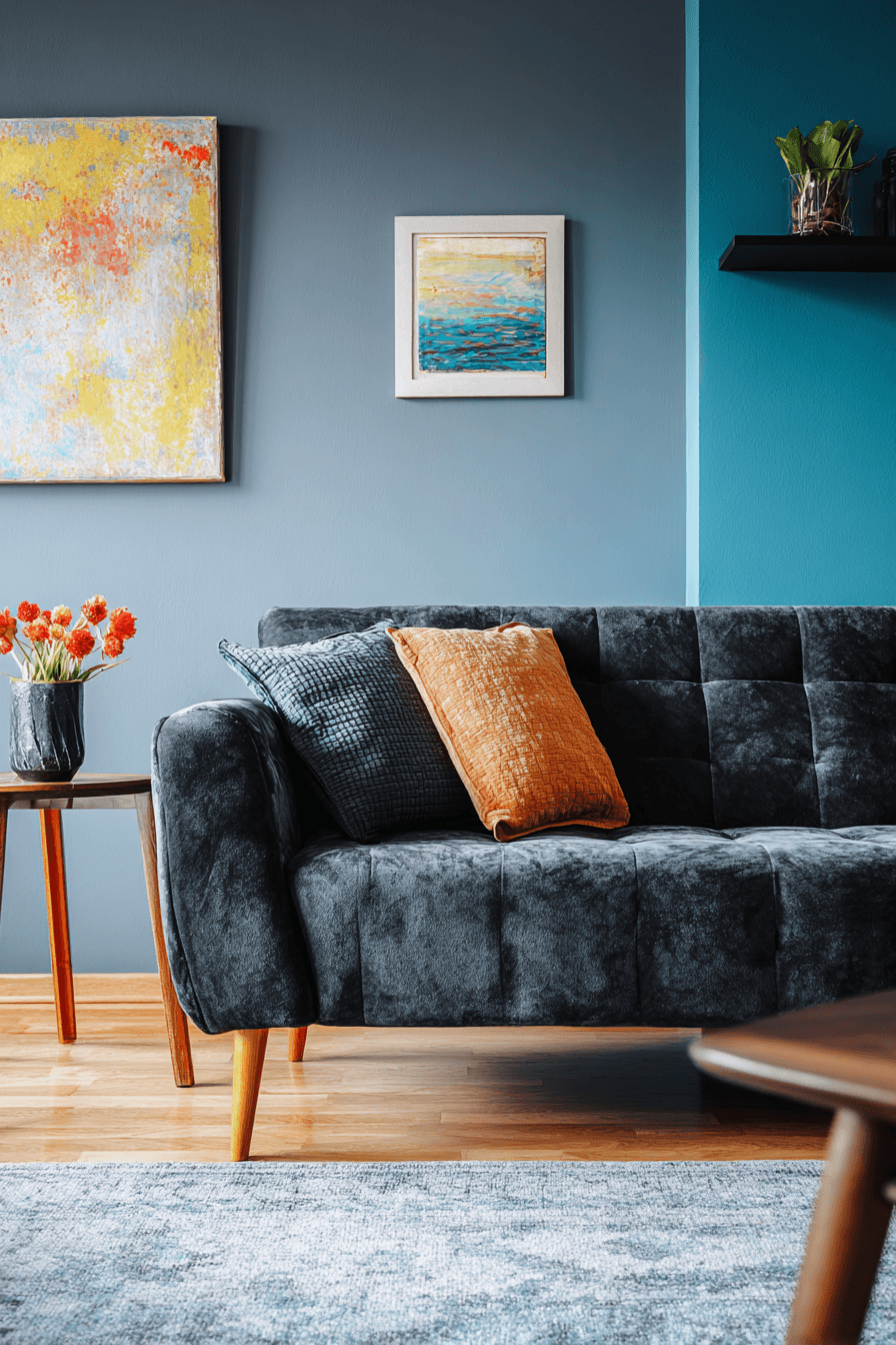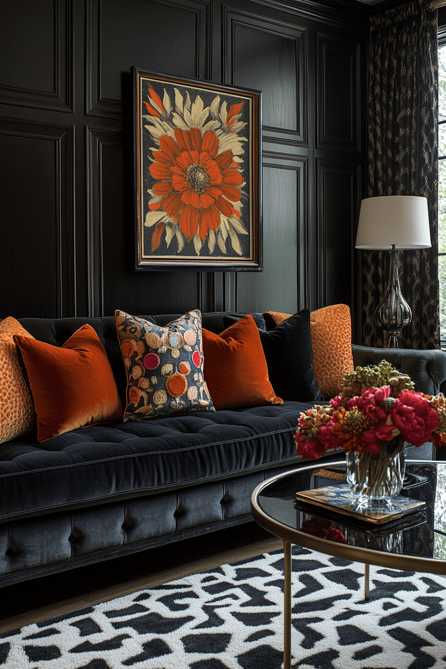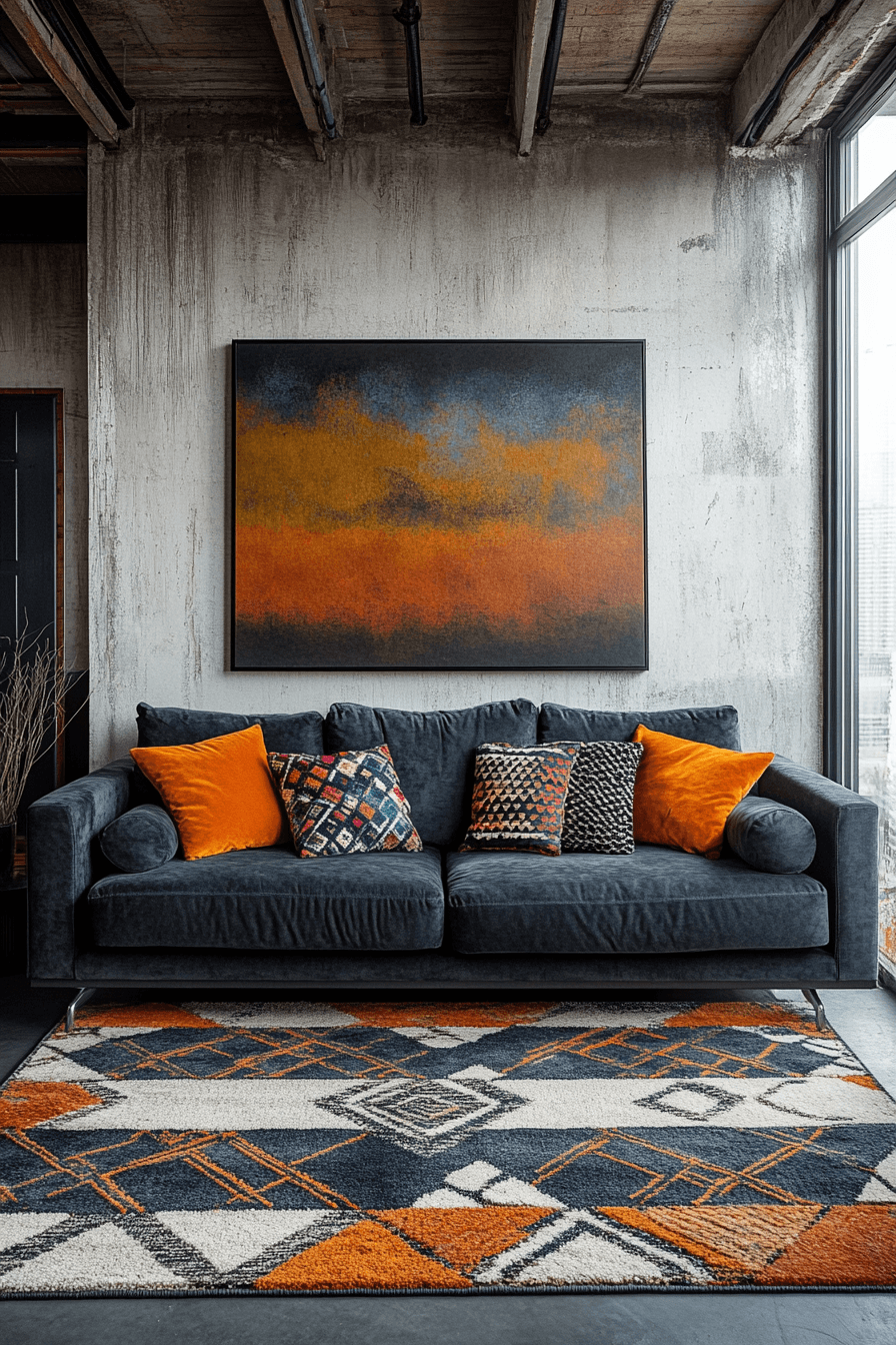 A bold and lively dark grey sofa living room instantly draws attention with its vibrant mix of color and creativity. The deep grey sofa anchors the space while bright artwork and playful decor bring it to life. Geometric patterns and sculptural lighting add movement and visual excitement throughout the room. Every detail feels intentional, expressive, and full of personality. This look is perfect for anyone who loves to make a statement. Dive into more daring design inspiration and refresh your space now.