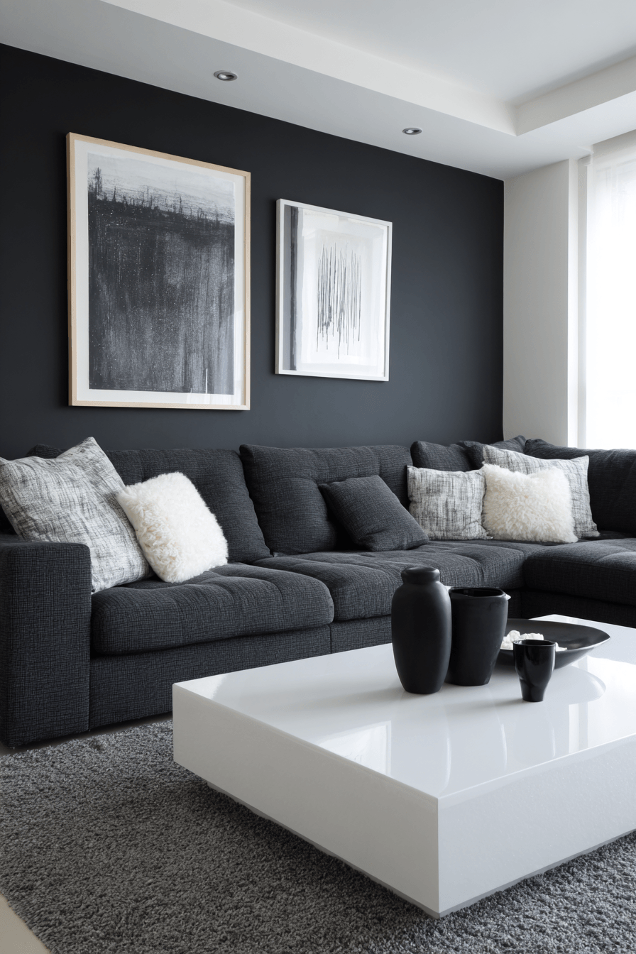 A bold yet balanced dark grey sofa living room embraces minimalist maximalist style with striking simplicity. Clean lines and uncluttered layouts provide a calm foundation for standout statement pieces. Oversized artwork, sculptural lighting, or dramatic decor add just the right amount of visual excitement. The sofa anchors the room while allowing key features to shine. This approach keeps the design intentional, stylish, and full of personality. Step into this trend and redefine your space with confidence.