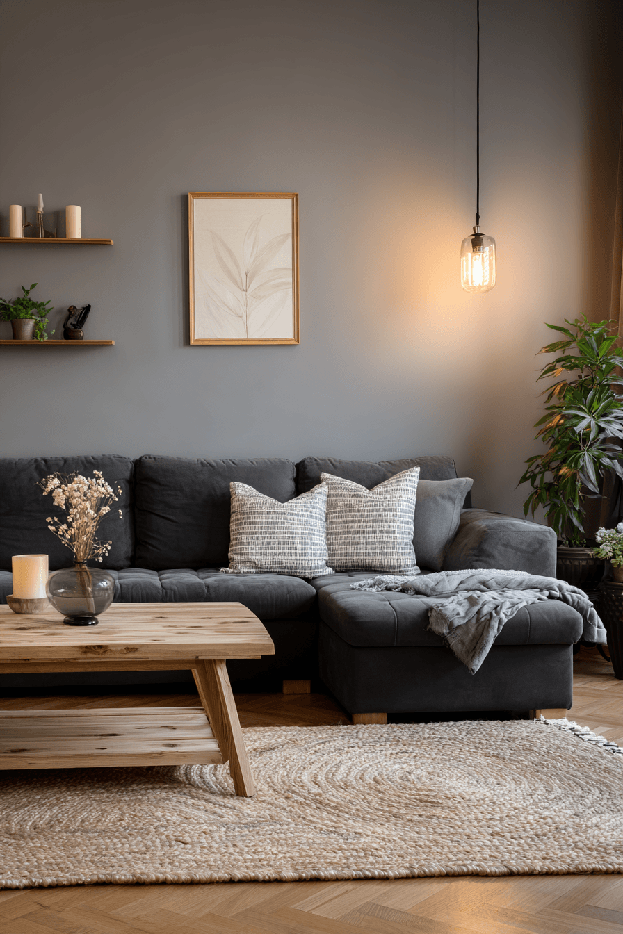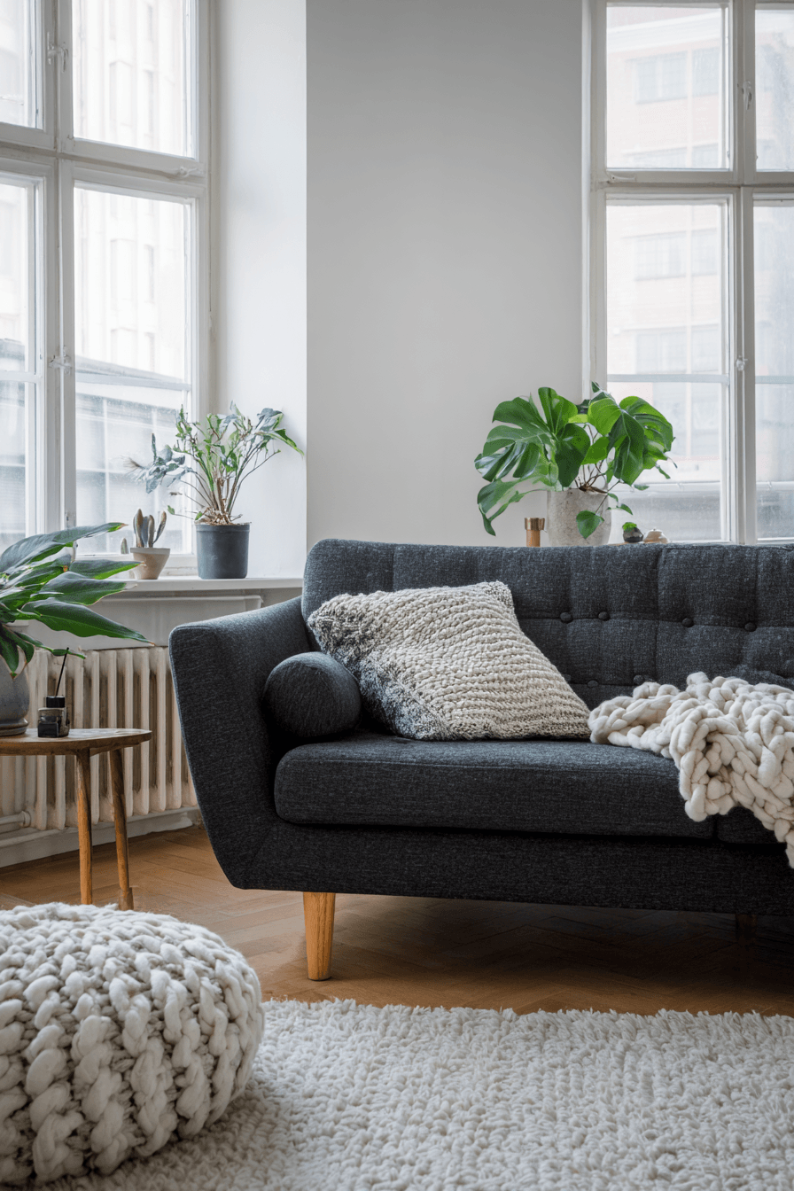 A Scandinavian-style dark grey sofa living room brings together warmth, function, and effortless charm. Pale wood floors and crisp white walls brighten the room while the sofa adds grounding depth and contrast. Cozy layers like wool throws and soft rugs make the space feel welcoming and comfortable. Every piece serves a purpose, which helps the room stay clean, calm, and inviting. This look is perfect for anyone who loves design that feels both practical and beautiful. See how Scandinavian touches can transform your living area into a cozy retreat.