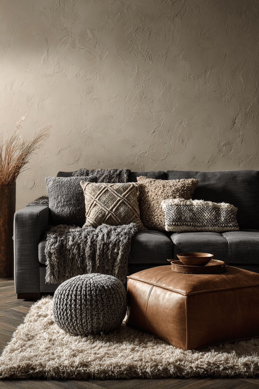 A layered dark grey sofa living room comes to life through rich textures that add depth and interest. From cozy knits to boucle fabrics, every element invites comfort and warmth. The monochromatic palette keeps the look refined while letting texture take center stage. Mixing materials like leather, linen, and woven accents adds dimension without overwhelming the space. The result feels sophisticated yet incredibly welcoming. Explore more texture-driven ideas and give your living room a fresh, cozy upgrade.
