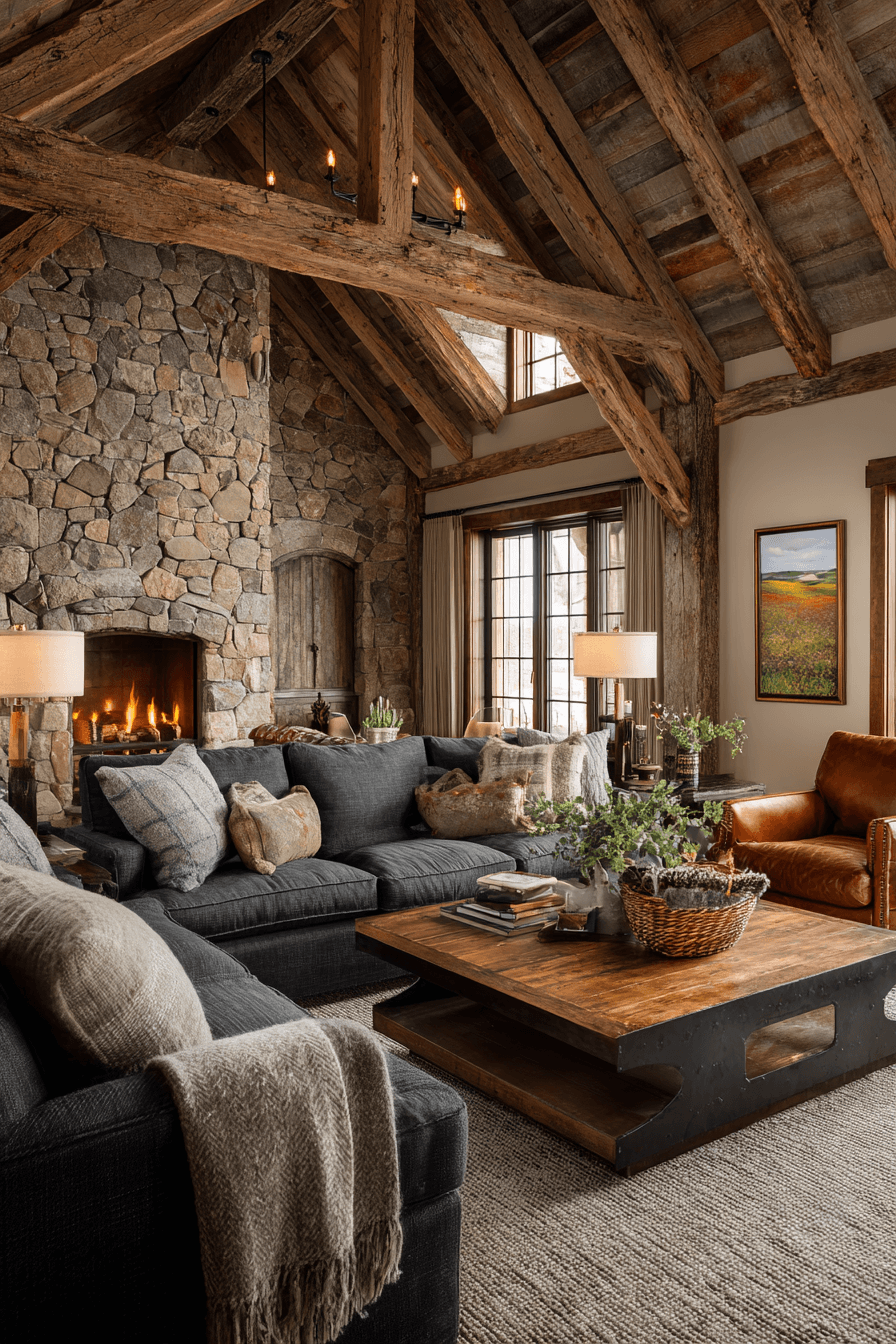 A cozy and inviting dark grey sofa living room takes on rustic warmth with natural textures and earthy elements. The sofa pairs effortlessly with reclaimed wood, stone finishes, and soft woven fabrics that add depth and comfort. Layers of chunky knits and leather accents enhance the relaxed, lived-in feel. The cool grey tone balances the warmth for a perfectly harmonious look. This design feels both grounded and stylish at the same time. Get inspired to create your own rustic retreat with these ideas.