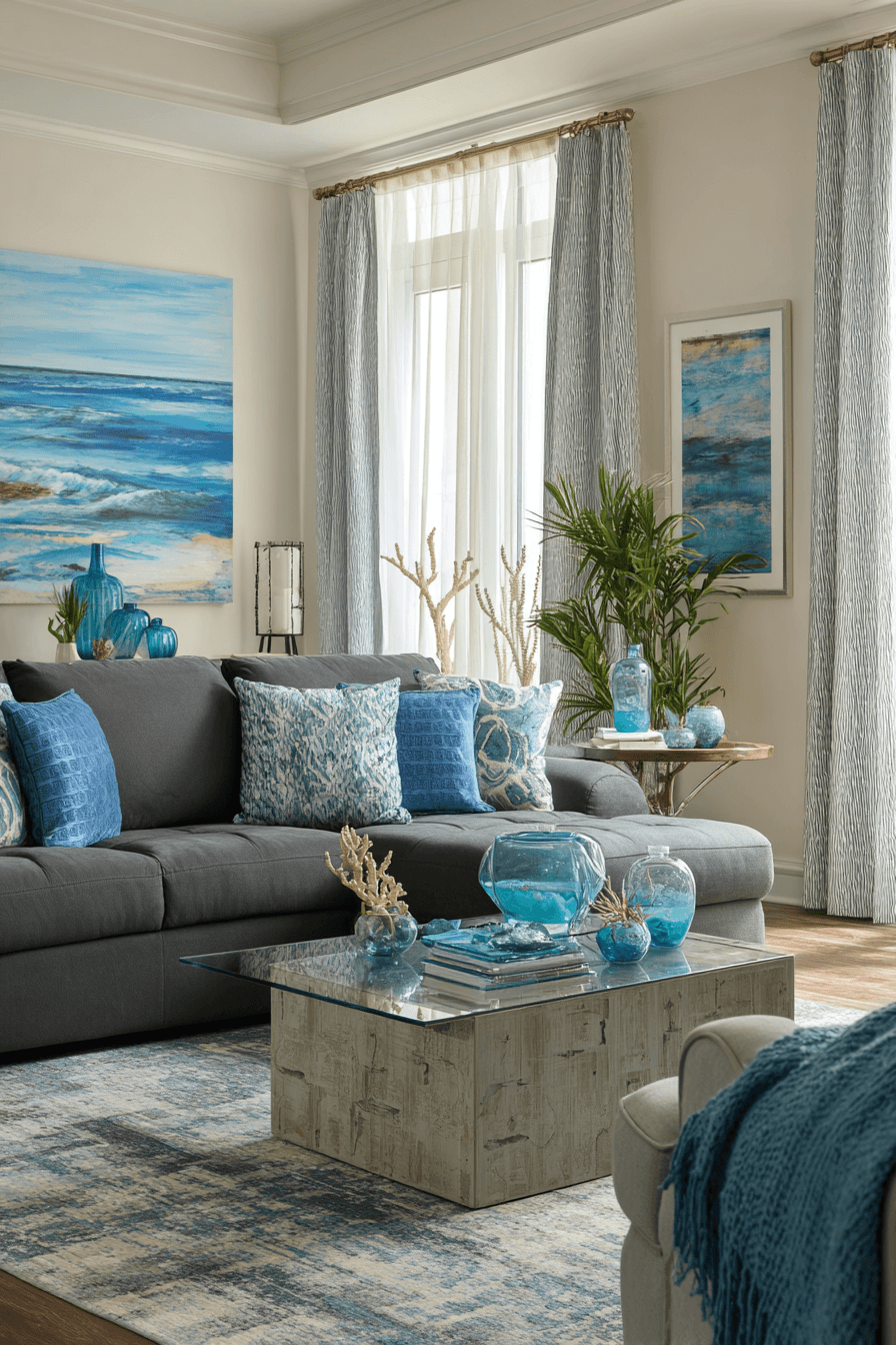 Fresh and breezy energy fills a dark grey sofa living room inspired by ocean tones and coastal charm. Shades of blue, seafoam green, and sandy neutrals complement the richness of the sofa beautifully. Light fabrics, airy layouts, and ocean-inspired decor bring a sense of calm and openness. Elements like abstract water art or subtle shell accents complete the look effortlessly. The space feels refreshing, relaxed, and full of life. Dive into more ocean-inspired decor ideas and transform your living room.