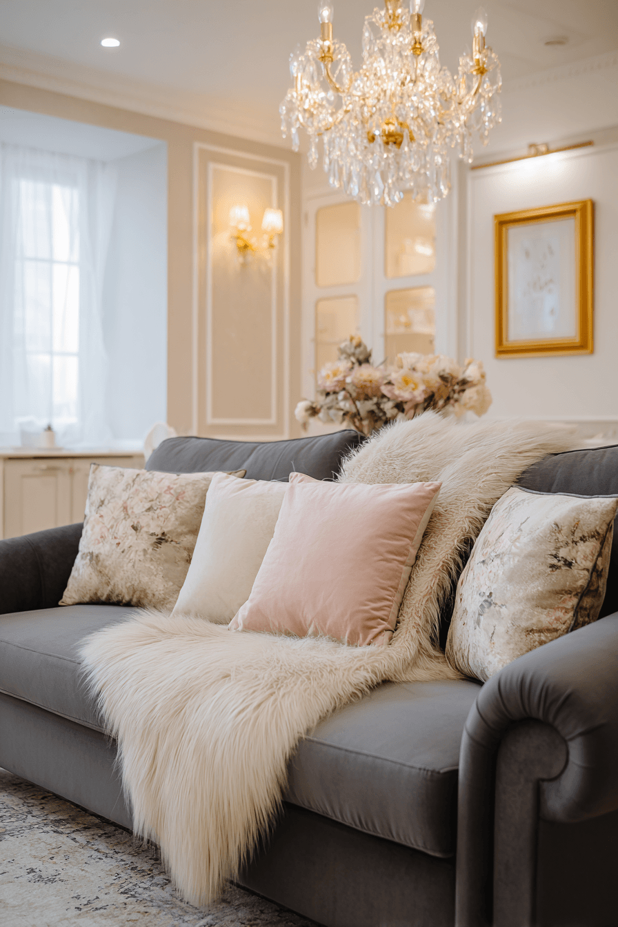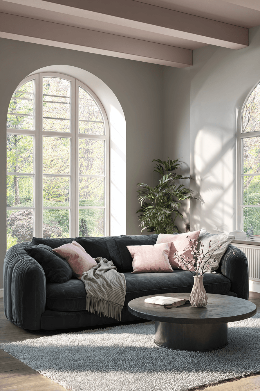 Soft, romantic energy comes alive in a beautifully styled dark grey sofa living room where plush textures and muted tones set the mood. Velvet pillows, flowing curtains, and warm ambient lighting create a gentle glow that feels both cozy and refined. Light pastel accents soften the look while the sofa provides a strong, grounding centerpiece. This design strikes the perfect balance between elegance and everyday comfort. It’s a space that feels luxurious yet completely inviting. Discover more dreamy ideas to elevate your living space today.