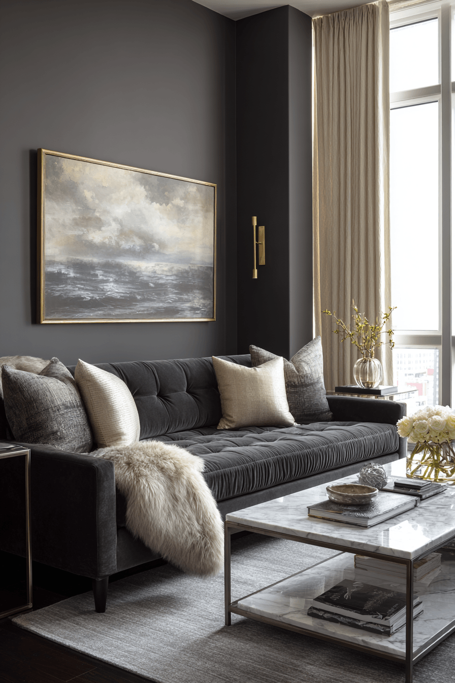 A refined and calming dark grey sofa living room showcases understated luxury through rich materials and subtle details. Think smooth marble surfaces, plush wool rugs, and carefully chosen decor that adds quiet sophistication. The dark grey sofa living room grounds the space while soft textures and gentle metallic hints enhance its depth. Nothing feels excessive, yet every element feels premium and intentional. This style is all about quiet confidence and elevated comfort. Get inspired to create your own effortlessly luxurious retreat.