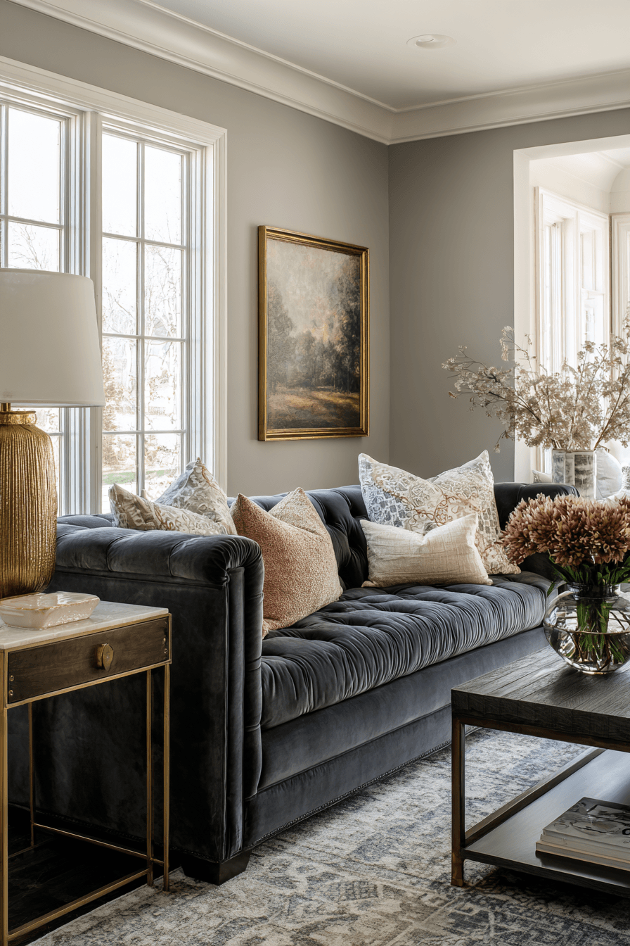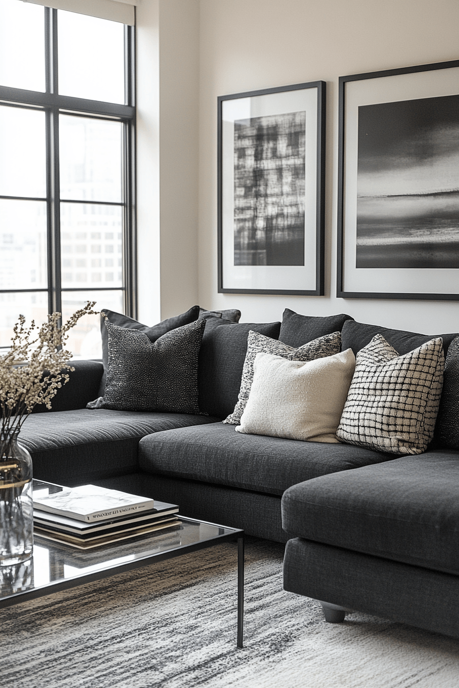 A chic dark grey sofa living room becomes even more captivating with the addition of shimmering metallic accents. Elements like chrome, brushed gold, or silver reflect light and add a polished, upscale feel. These finishes pair beautifully with the richness of the grey sofa, enhancing its depth. Keeping the rest of the decor minimal allows the metallic details to truly shine. The overall vibe feels sleek, modern, and effortlessly elegant. Find more ways to add sparkle and elevate your living room style.