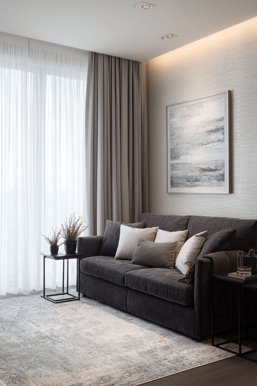 A dark grey sofa living room can feel soft and elevated when styled with a contemporary luxury approach. Light curtains and textured rugs create contrast against the deeper sofa tone, making the room feel balanced and inviting. Streamlined furniture keeps the design polished while still allowing the space to feel relaxed. Metallic accents in gold or silver add just the right amount of sophistication without overpowering the room. The overall effect is elegant, simple, and quietly luxurious. Take a closer look at this chic style and get inspired for your own home.