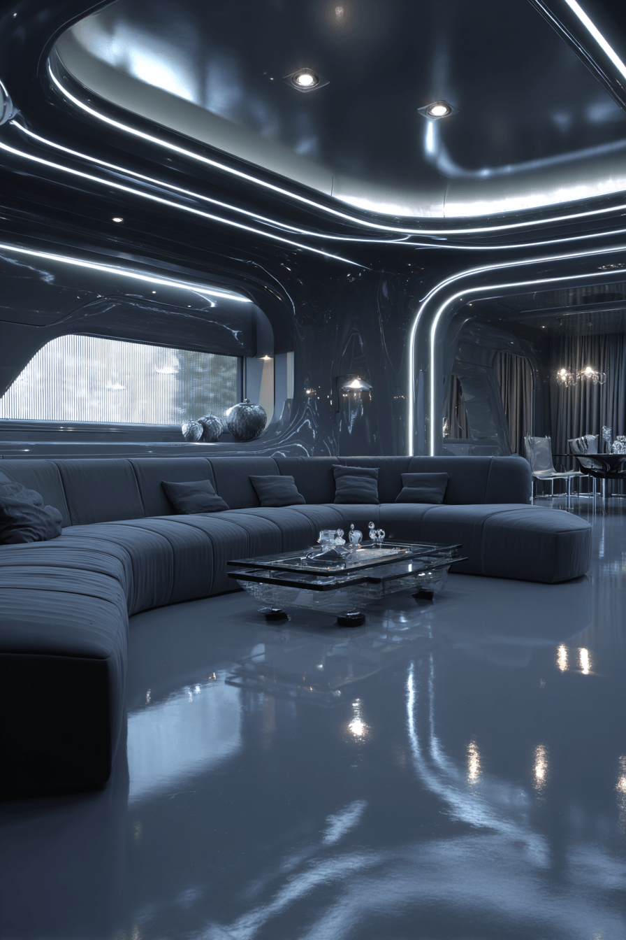 A dark grey sofa living room can feel bold and forward-looking when paired with futuristic details and smooth finishes. Reflective surfaces and LED lighting add a sleek, high-tech atmosphere that feels fresh and creative. The sofa grounds the room while white accents and chrome elements brighten and energize the design. Geometric shapes and streamlined furniture complete the clean, modern look. This setup is perfect for anyone drawn to innovative style with everyday comfort. Step into this futuristic aesthetic and spark new ideas for your living room.
