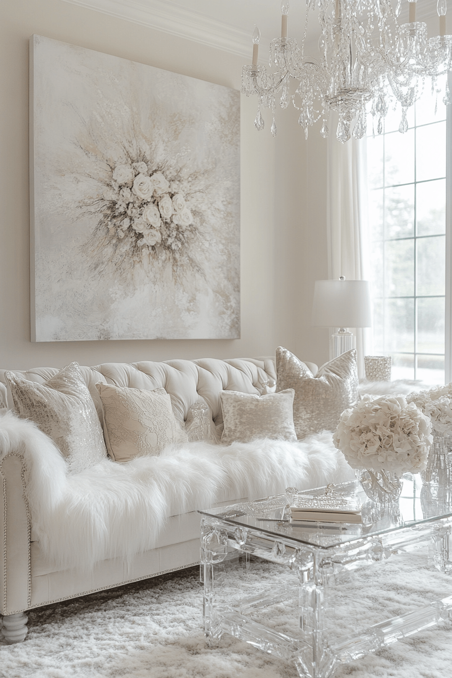 Clear acrylic and crystal accents add a light, modern sparkle to elegant living room design without adding visual weight. Their transparency keeps the room feeling open while still introducing a hint of glam. These pieces pair beautifully with plush seating and metallic details for a balanced look. The result feels fresh, airy, and quietly luxurious. This combination works well because it adds shine without cluttering the space. Discover more ways to incorporate subtle glam into your design.