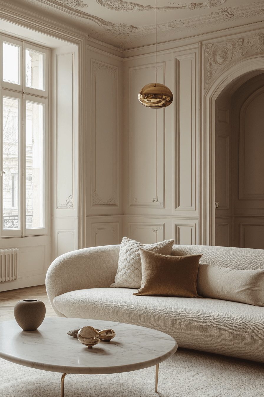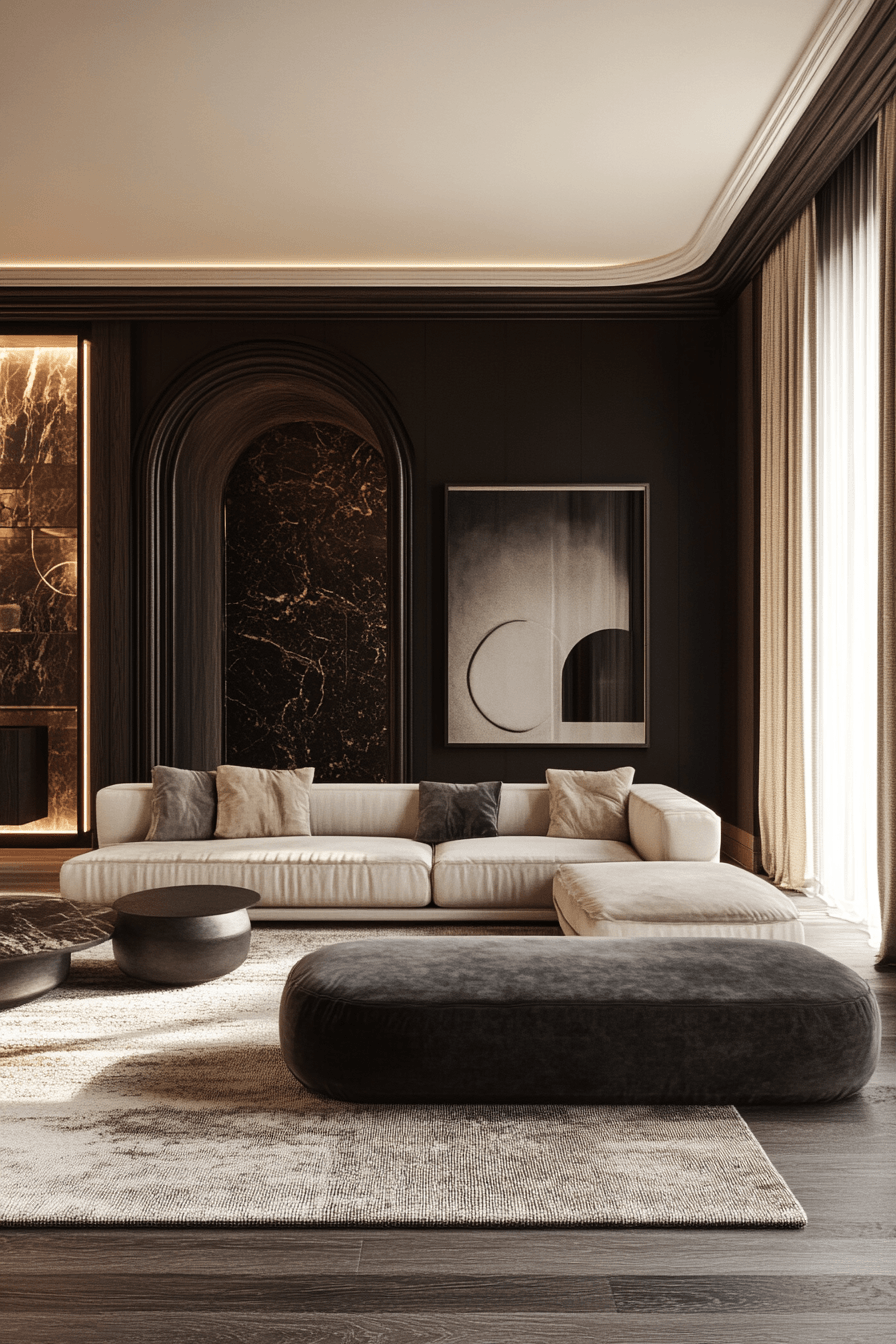 Curved elements introduce softness and movement that beautifully complement elegant living room design. Features like arched openings, rounded mirrors, and sculptural seating create a gentle visual flow. These shapes balance out sharper lines and structured layouts. Soft lighting enhances the curves, creating subtle shadows that add depth. The mix of curved and straight elements feels modern and thoughtfully layered. Explore more ideas that bring graceful shapes into your space.