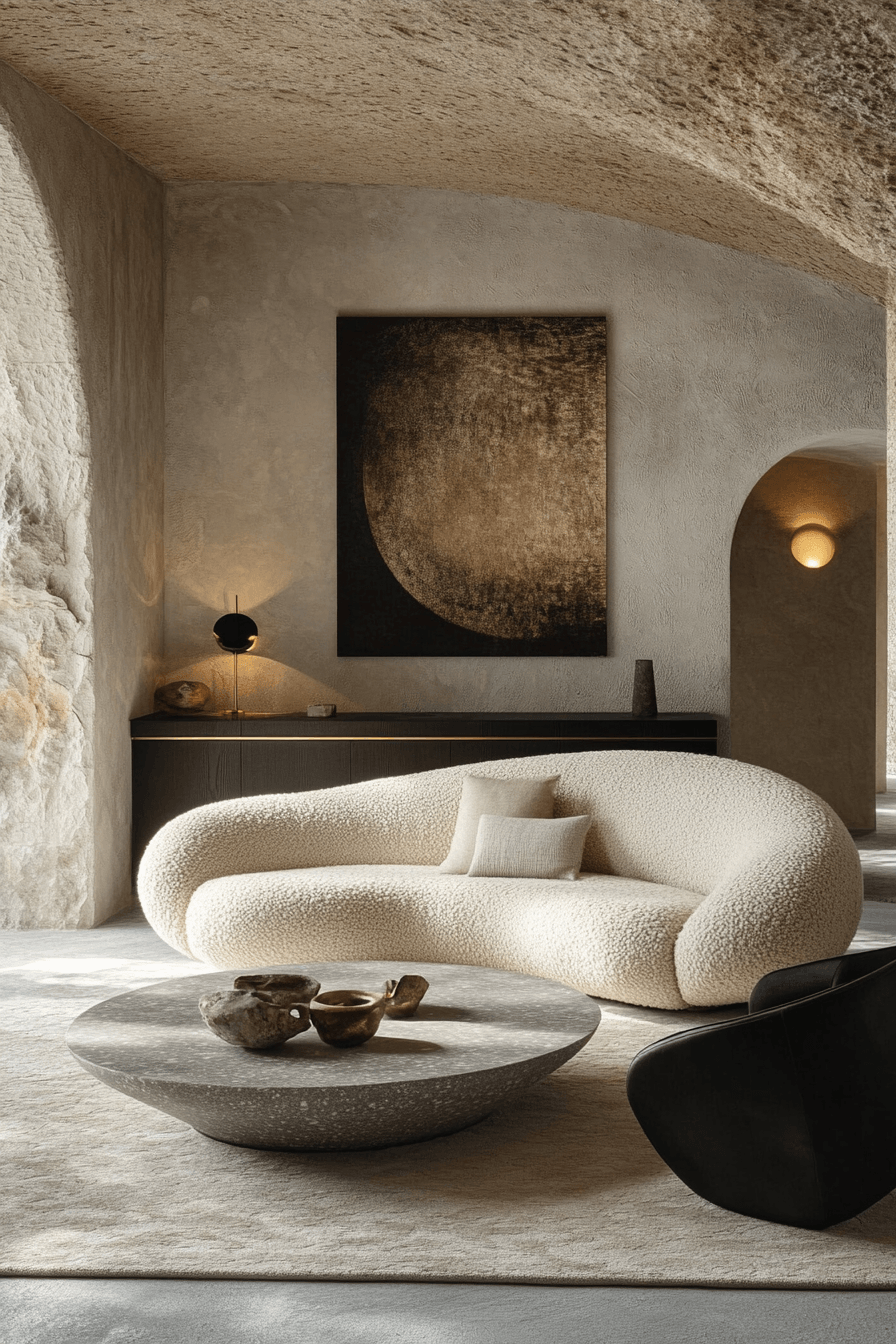 A sculptural sofa with curved edges or bold structure can become the centerpiece of an elegant living room design. Its unique shape adds personality while still maintaining a clean, modern feel. Neutral fabrics help highlight the form without competing with other elements in the space. When styled with minimal decor and a standout coffee table, the room feels intentional and well-balanced. Strong silhouettes naturally bring a sense of confidence and quiet sophistication. Click to explore more eye-catching living room ideas.