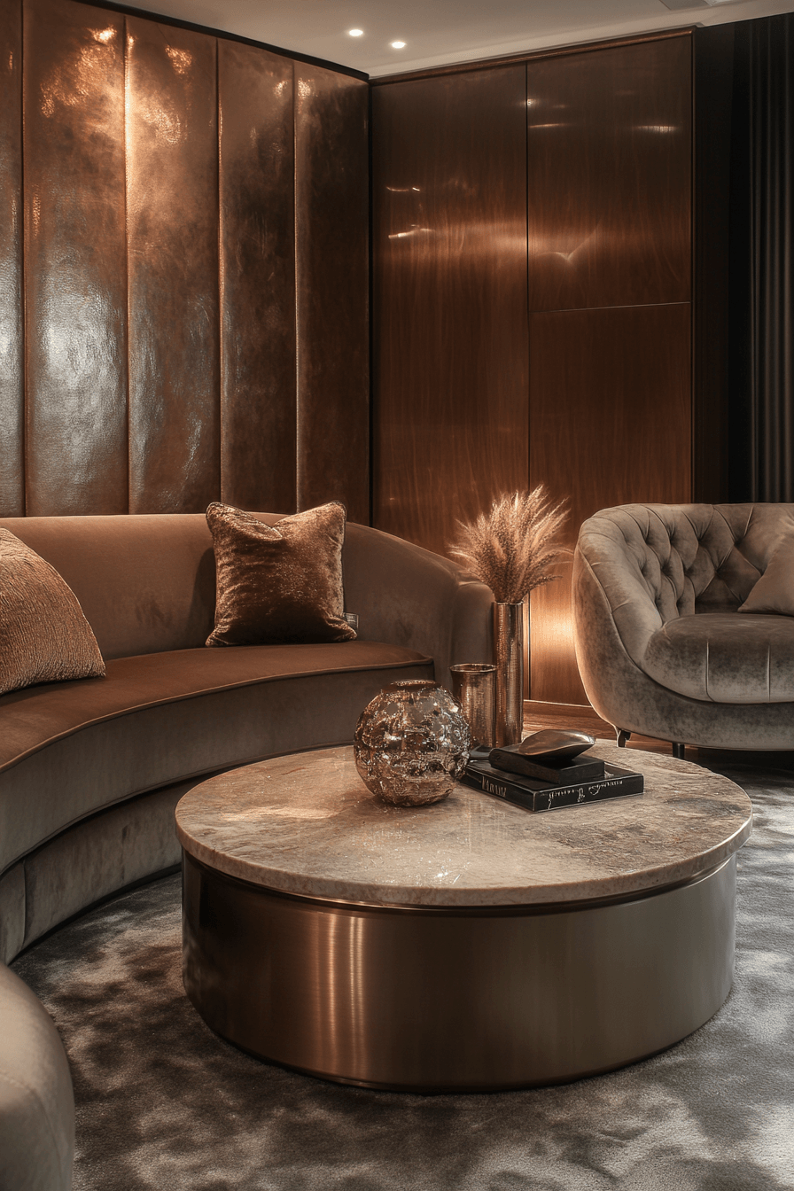 Brushed metal finishes add a quiet sense of polish to elegant living room design without feeling overly flashy. Subtle golds, soft silvers, or muted bronze accents catch the light in a refined way. Mixing different metal tones creates depth while still feeling cohesive. Warm lighting enhances their natural glow and keeps the look inviting. These small details add sophistication without overwhelming the room. Discover how to incorporate modern metallic touches with ease.