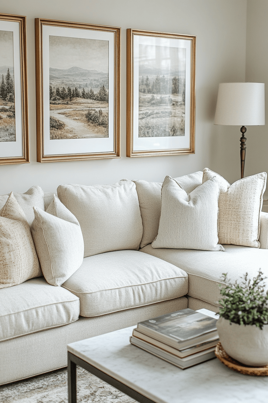 A thoughtfully curated gallery wall can instantly elevate elegant living room design with personality and style. Coordinated frames keep the display organized while still allowing for creativity. Larger artwork pieces can anchor the wall and create a strong focal point. Even spacing helps maintain a clean and polished look. Neutral walls allow the artwork to stand out without distraction. Tap to create a gallery wall that feels both personal and sophisticated.