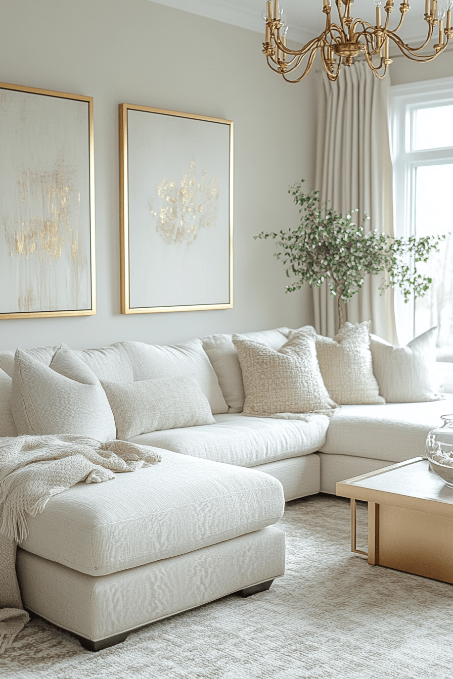 Soft gold accents introduce warmth and a hint of glamour that fits seamlessly into elegant living room design. Details like brushed gold lighting, slim mirrors, or delicate tables catch the light in a subtle and beautiful way. Keeping these touches minimal helps maintain a refined and uncluttered look. Gold pairs effortlessly with soft neutrals, deep charcoals, and muted greens for a balanced palette. This approach adds just the right amount of luxury without overpowering the space. Explore more ideas that bring a soft golden glow into your home.