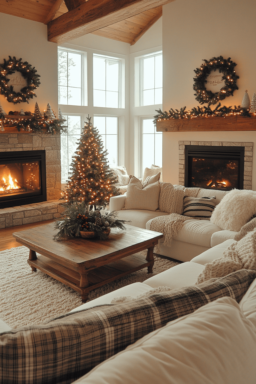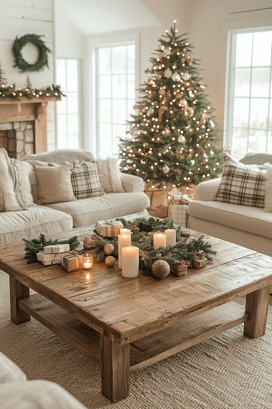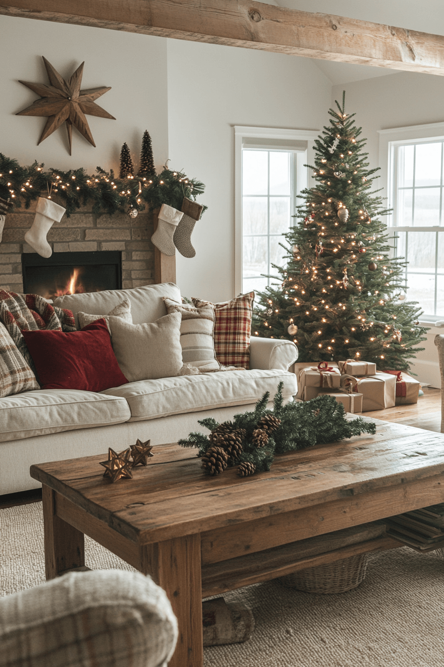 Fill your living room with the inviting charm of farmhouse Christmas decor that feels timeless and cozy. Layer soft plaid blankets, wooden accents, and flickering candles for a space that glows with warmth. A tree trimmed with burlap and simple ornaments ties the rustic theme together beautifully. The scent of pine and candlelight wraps your home in comfort.
