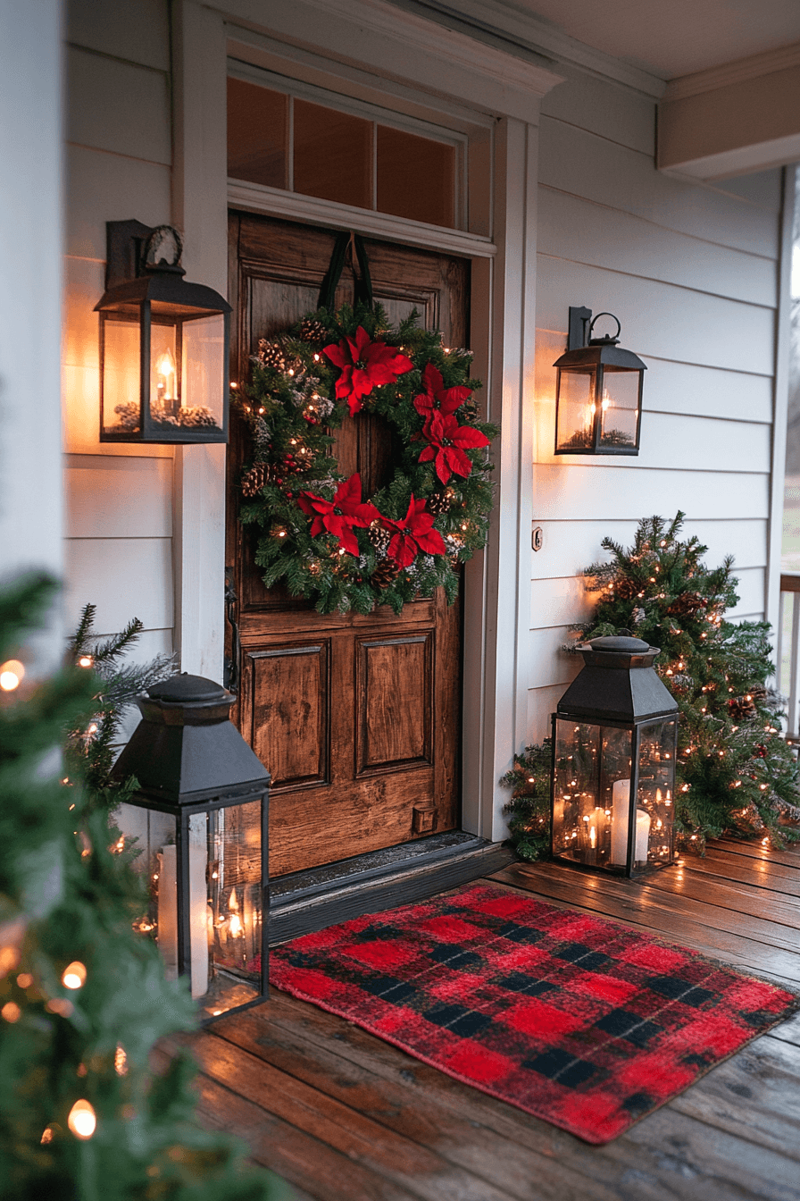 Make your front door glow with the timeless beauty of farmhouse Christmas decor. A fresh wreath, twinkling lights, and rustic signage create a scene straight out of a holiday postcard. Add lanterns or plaid mats to complete the look. The charm feels both classic and inviting.