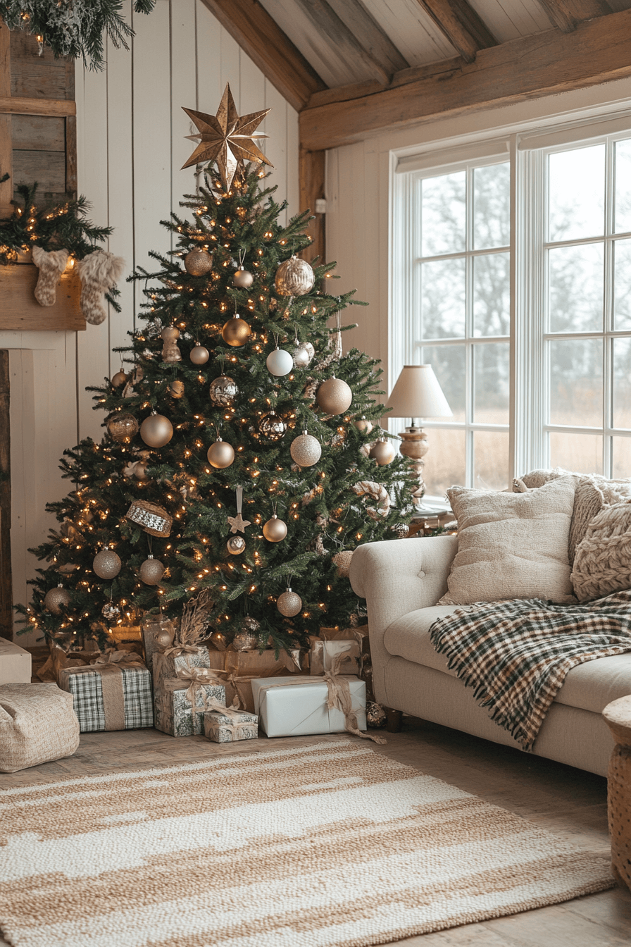 Adorn your Christmas tree with the pure simplicity of farmhouse Christmas decor. Burlap ribbons, wooden ornaments, and soft lights make it feel effortlessly elegant. The neutral palette complements any space. It’s a blend of nature and nostalgia that never fades.