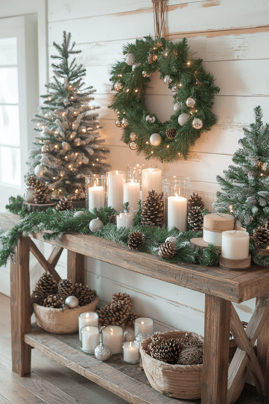 Transform your console table into a statement of farmhouse Christmas decor beauty. Layer candles, mini trees, and greenery over rustic wood surfaces. Add gold accents for a subtle sparkle. The look balances warmth with sophistication.