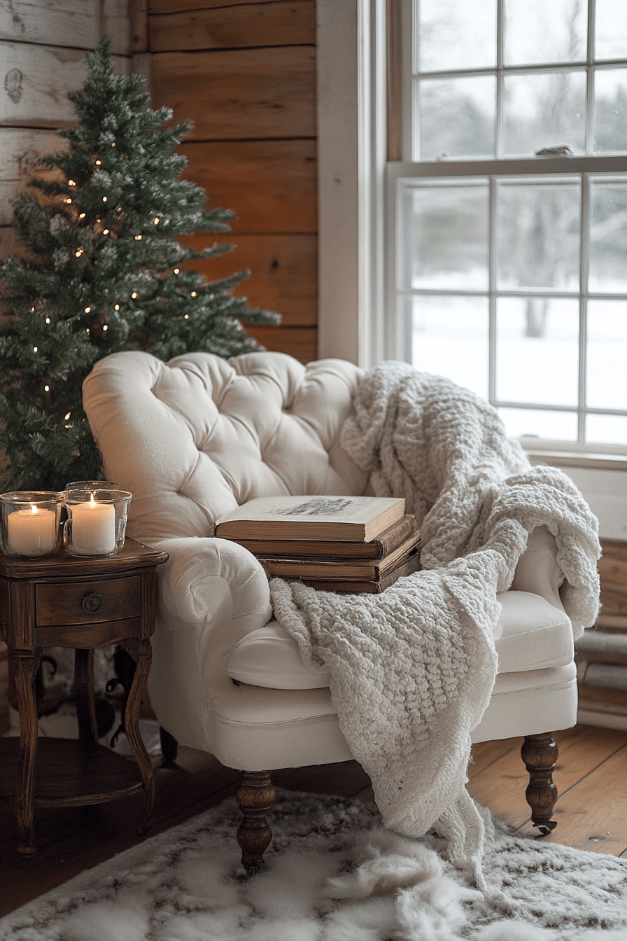 Create a peaceful reading corner enhanced by farmhouse Christmas decor details. A soft throw, pine garland, and glowing lantern turn the space into a festive hideaway. Add a stack of books and a warm drink to complete the mood. It’s comfort and calm in perfect balance.