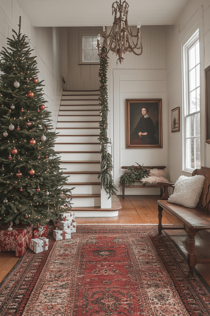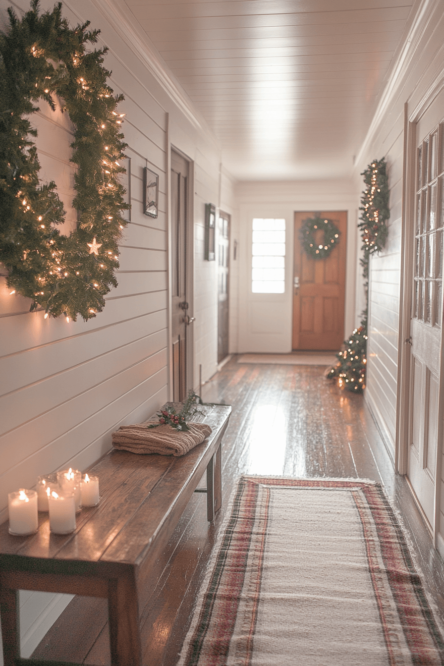 Adorn your hallway with farmhouse Christmas decor that connects every space in festive harmony. Soft garlands, subtle lighting, and wooden accents create a cozy walkway full of charm. Add small wreaths or lanterns for extra personality. The result feels like a gentle holiday glow guiding you home.