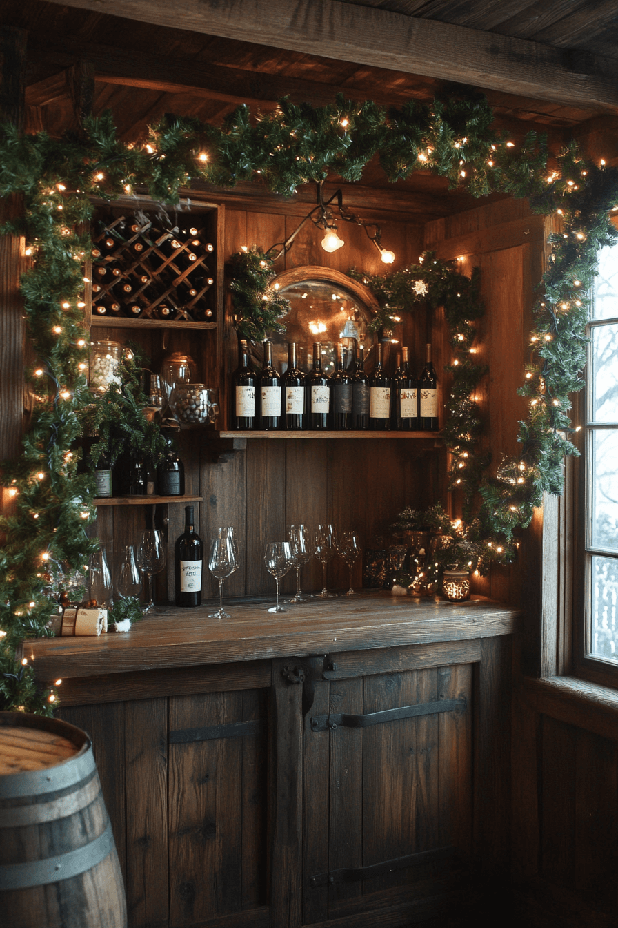 Add rustic sophistication to your wine room with the timeless appeal of farmhouse Christmas decor. Pine garlands, flickering candles, and gold accents create an intimate glow. The combination of textures feels luxurious and grounded. Every sip becomes a celebration.