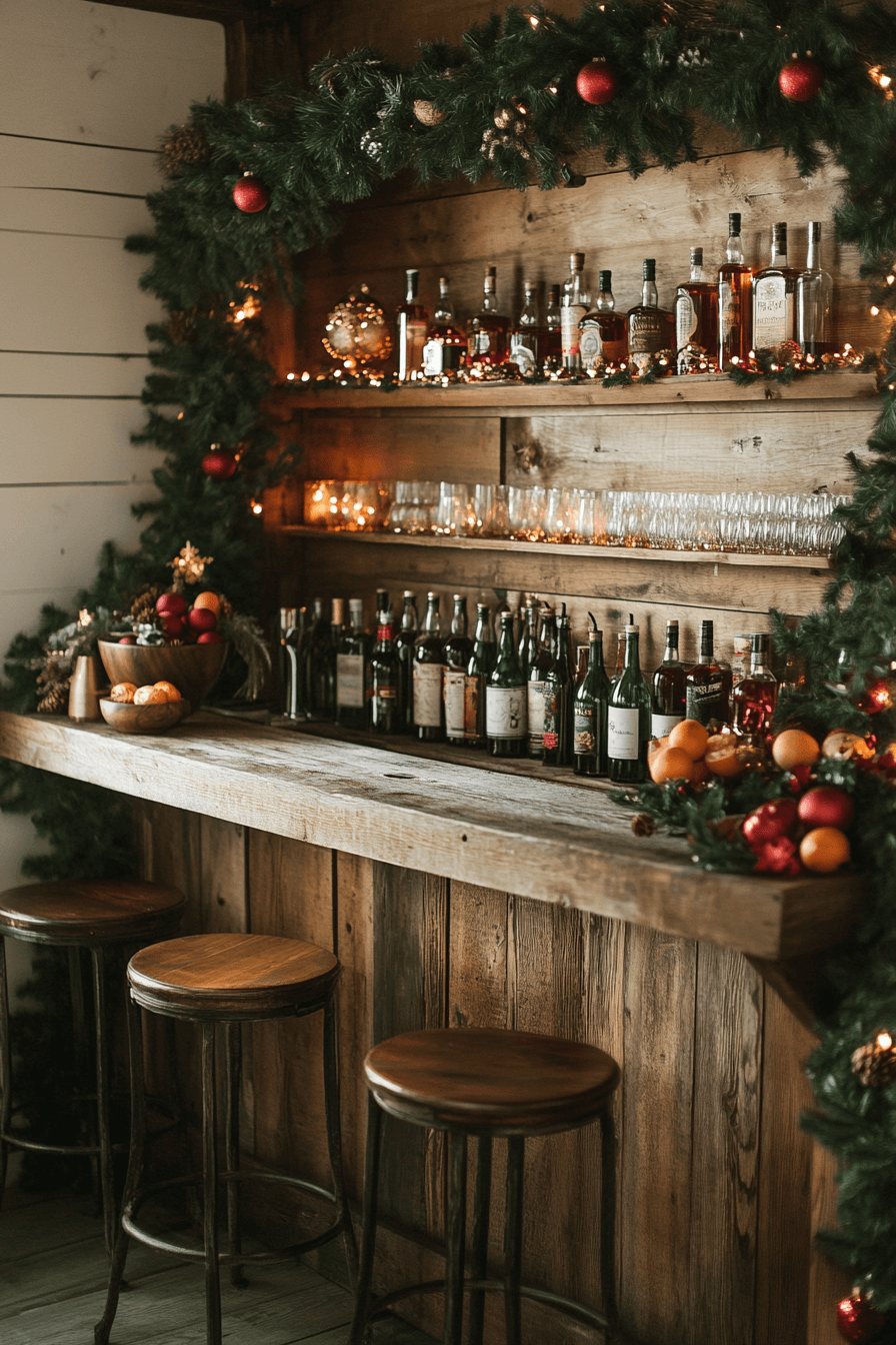 Give your wet bar a festive twist with cozy farmhouse Christmas decor. Add twinkle lights, rustic signage, and evergreen garlands for warmth. Wooden trays and glassware complete the look beautifully. The space becomes a merry little retreat for the season.