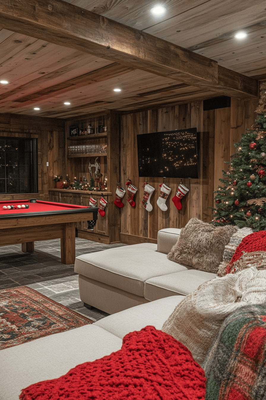 Turn your basement into a cozy Christmas lounge full of farmhouse Christmas decor character. Mix wooden furniture, festive lights, and plaid accents for a warm retreat. The glow feels intimate and joyful, perfect for gatherings. Add a tree or garland for the finishing touch.