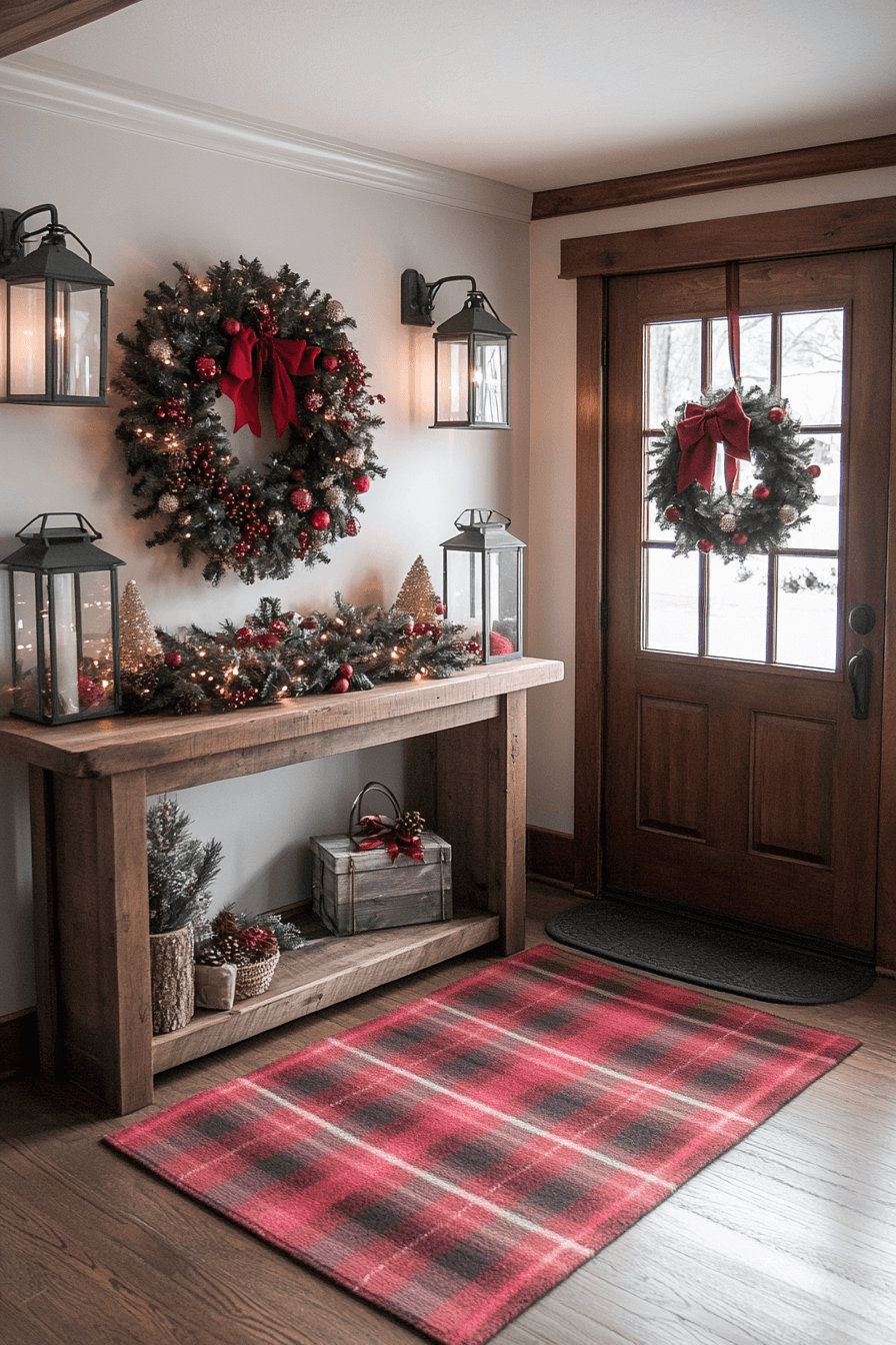 Greet guests with the joyful simplicity of farmhouse Christmas decor that radiates warmth from the moment they arrive. A pine wreath, glowing lanterns, and a rustic bench transform your entryway into a charming holiday moment. Add a plaid runner or twinkle lights for extra magic. The balance of texture and glow feels like a country Christmas dream.