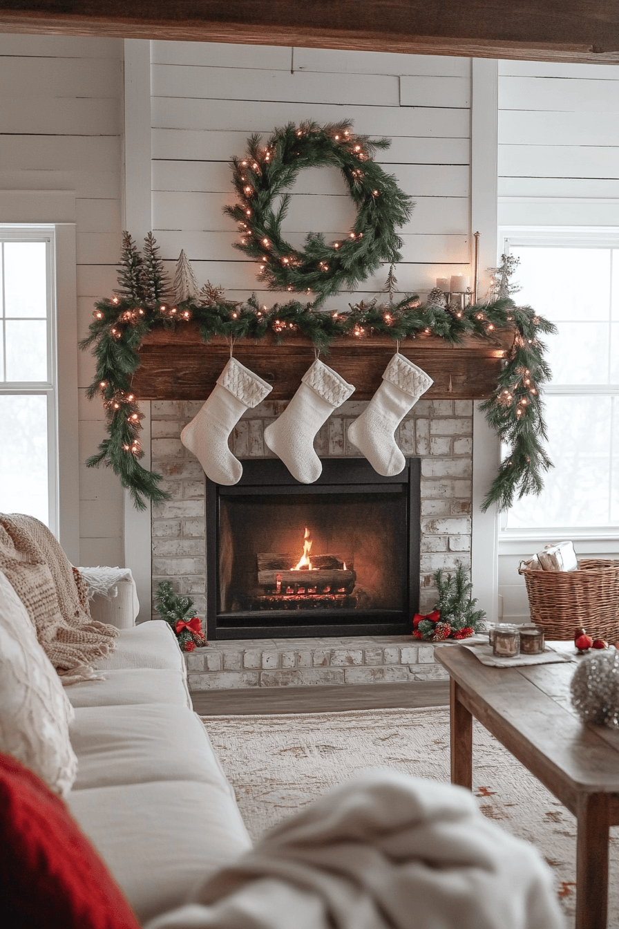 Bring your mantel to life with the cozy elegance of farmhouse Christmas decor. Drape garlands of pine and berries across wooden beams for a soft, natural touch. Add stockings, candles, and warm lighting to complete the scene. Each detail radiates simplicity and beauty.