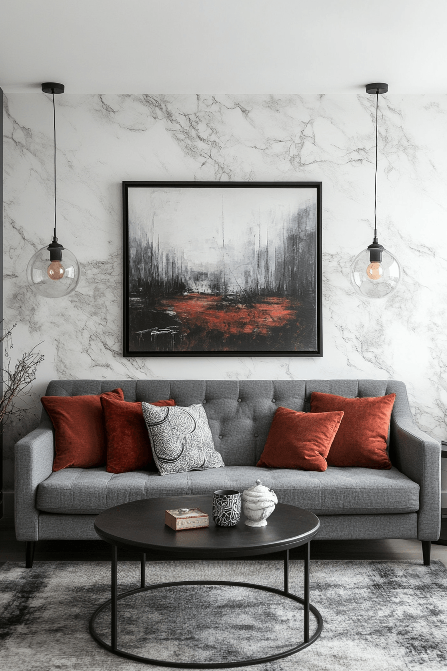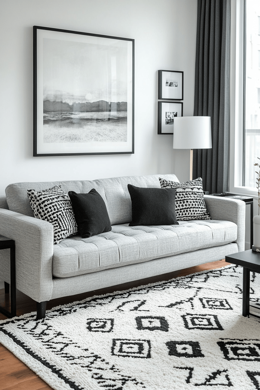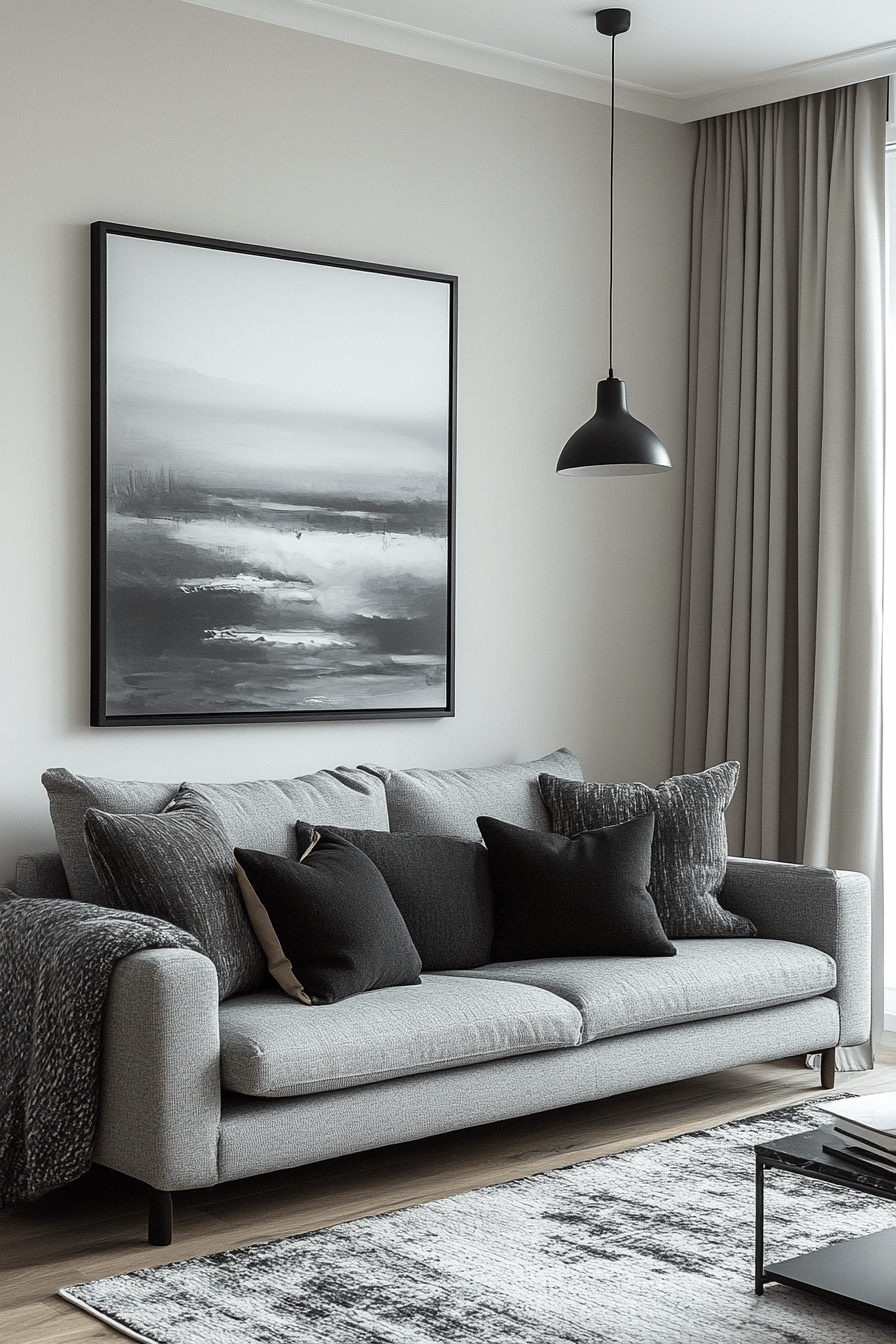 Sleek finishes can turn a grey couch living room into a bold and contemporary statement. The grey couch pairs seamlessly with sharp black and white contrasts for a striking look. Metallic touches and minimal artwork add a modern edge without overwhelming the space. Clean lines keep everything structured and visually cohesive. The design feels polished, confident, and effortlessly cool. Tap to explore more grey couch living room ideas with a modern vibe.