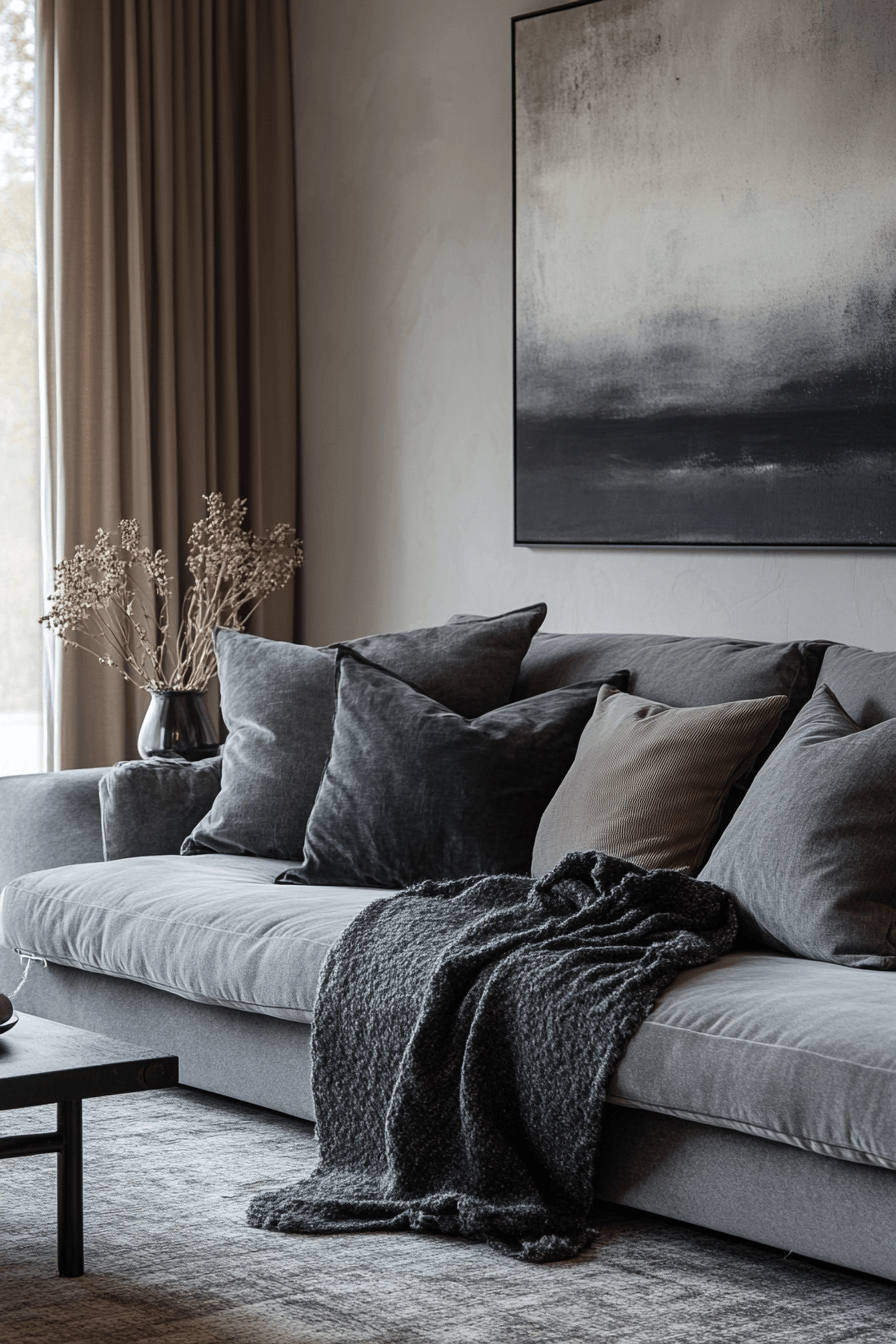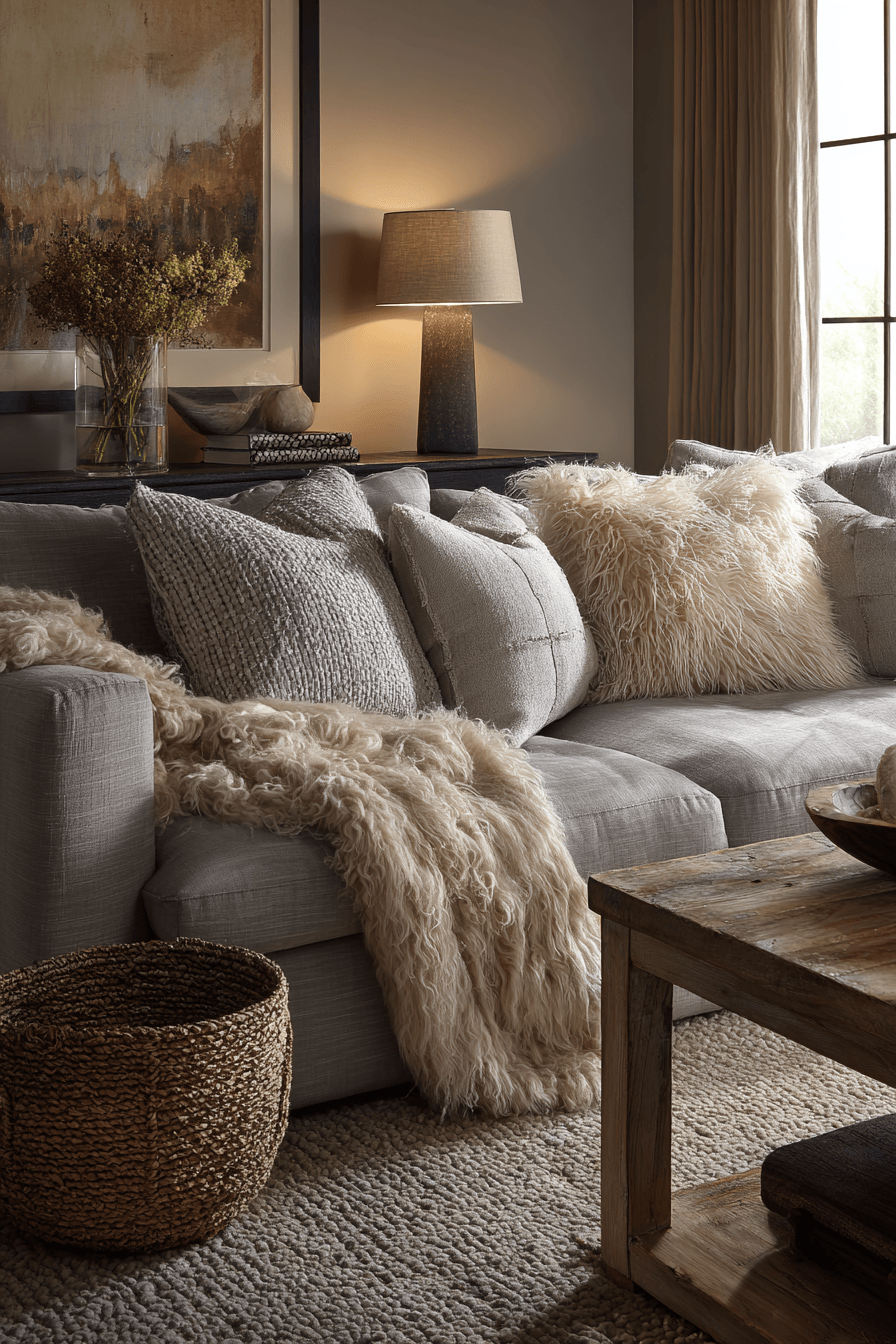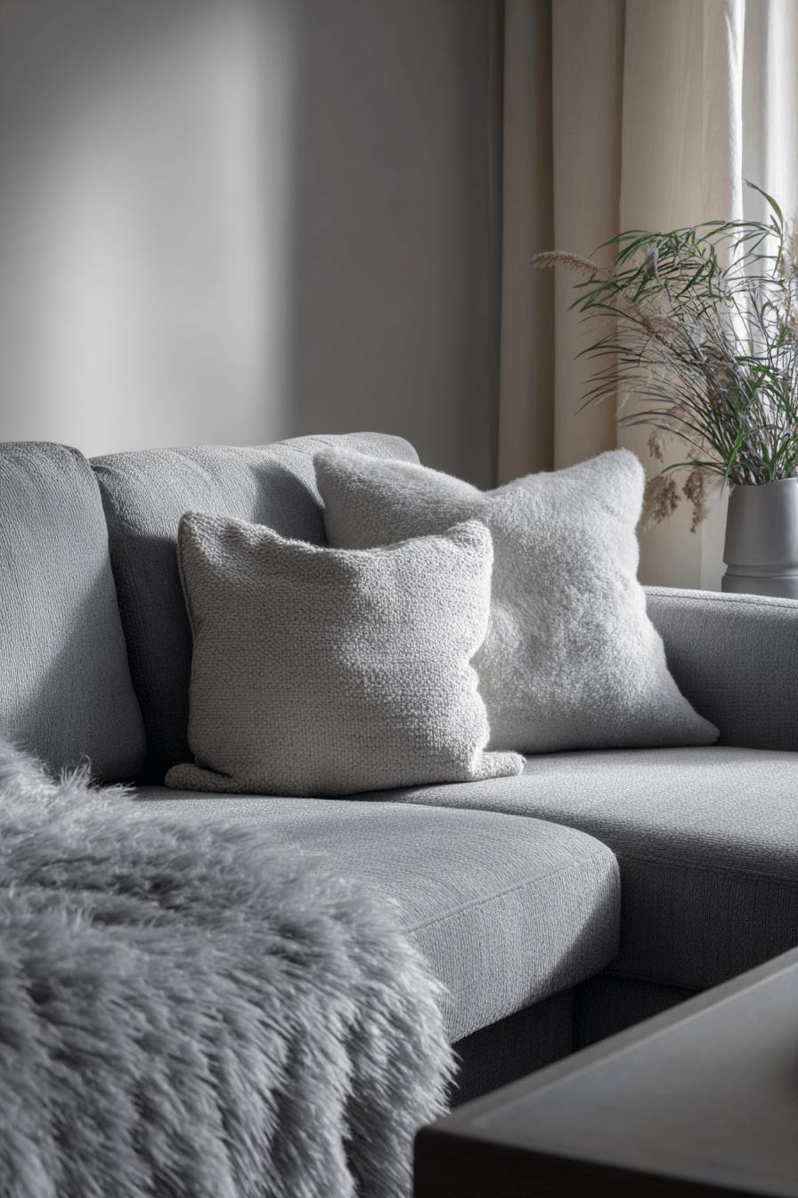 Soft layers can transform a grey couch living room into a warm, comforting escape that invites you to relax. The grey couch is enhanced with plush pillows and cozy throws in a mix of soothing textures. Materials like wool, cotton, and velvet create a rich, tactile experience. A soft rug underfoot adds to the inviting feel of the space. The atmosphere becomes calm, snug, and beautifully put together. Tap to discover more grey couch living room ideas designed for comfort.