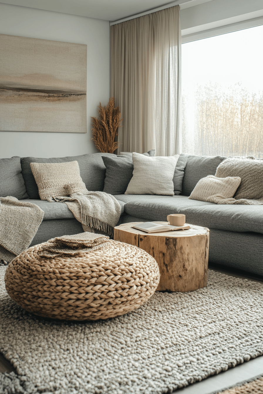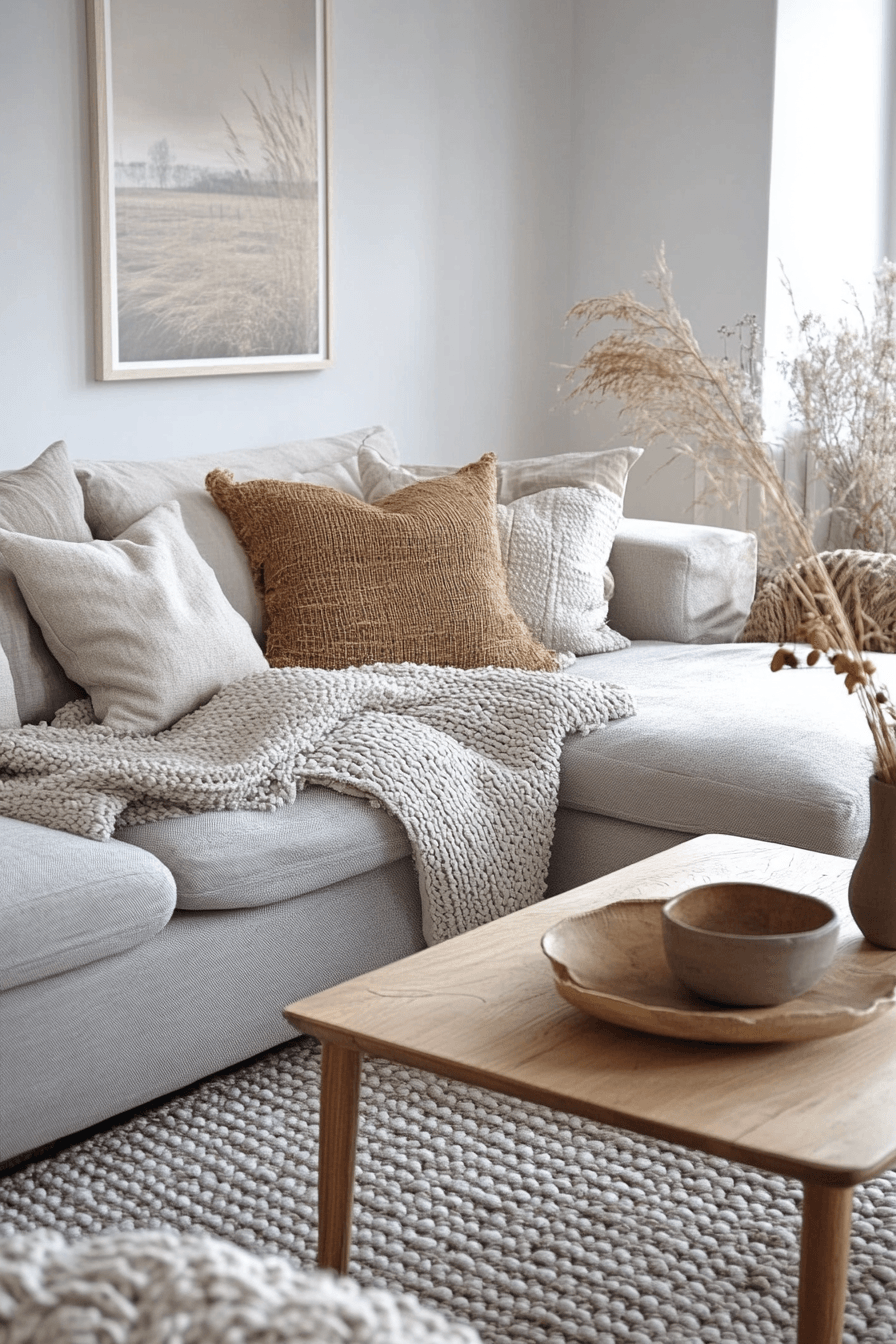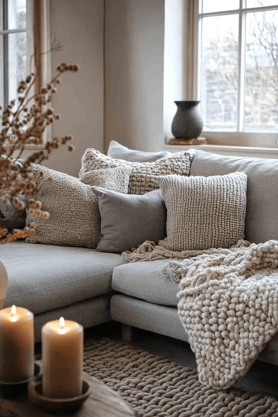 Soft layers can transform a grey couch living room into a warm, comforting escape that invites you to relax. The grey couch is enhanced with plush pillows and cozy throws in a mix of soothing textures. Materials like wool, cotton, and velvet create a rich, tactile experience. A soft rug underfoot adds to the inviting feel of the space. The atmosphere becomes calm, snug, and beautifully put together. Tap to discover more grey couch living room ideas designed for comfort.