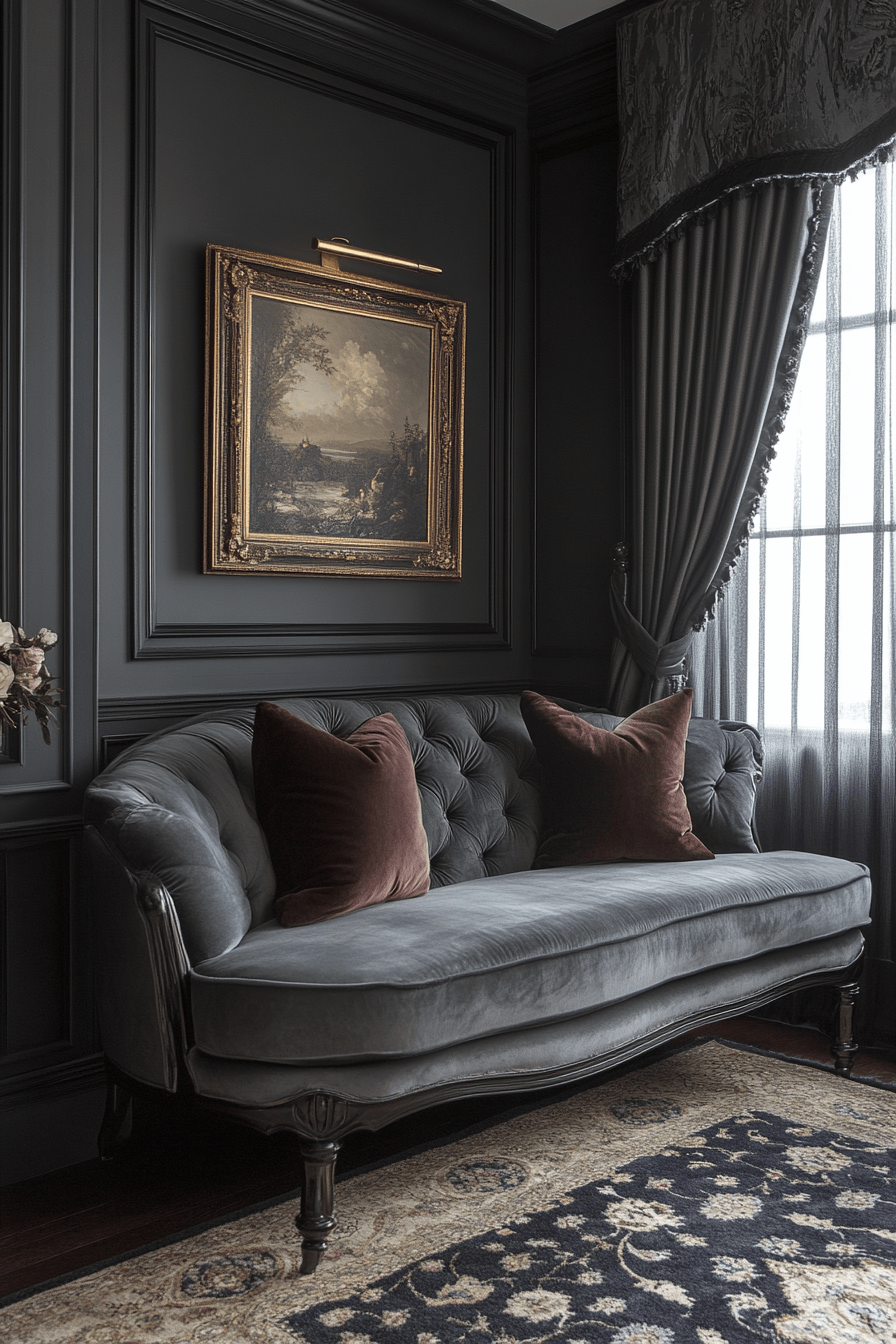 Plush materials can elevate a grey couch living room into a cozy, luxe haven with rich visual depth. A velvet grey couch sets the tone, while jewel-toned cushions add bold contrast. Layered fabrics and metallic accents bring a refined glow to the room. The mix of textures makes the space feel warm, inviting, and high-end. It’s comfort and elegance wrapped into one. Click to explore more grey couch living room ideas with a luxurious vibe.
