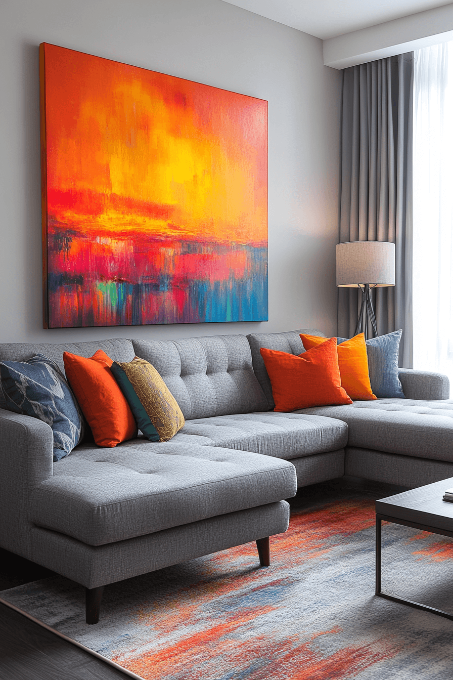 Expressive decor can turn a grey couch living room into a lively and personality-filled space that feels truly unique. The grey couch acts as a neutral backdrop, allowing bold artwork to take center stage. Vibrant colors and creative designs instantly energize the room. Simple furnishings keep the focus on the artistic elements without distraction. The result feels inspiring, fun, and full of character. Tap to uncover more grey couch living room ideas that highlight bold art.