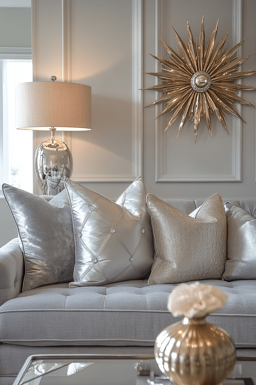 Adding a hint of shine can elevate a grey couch living room into a glamorous and eye-catching space. The grey couch pairs effortlessly with gold accents in cushions, lighting, and decor pieces. Metallic finishes reflect light and bring a soft glow to the room. This mix creates a polished look that still feels inviting and livable. The result is stylish, bold, and perfect for entertaining. Tap to uncover more grey couch living room ideas with a luxe feel.